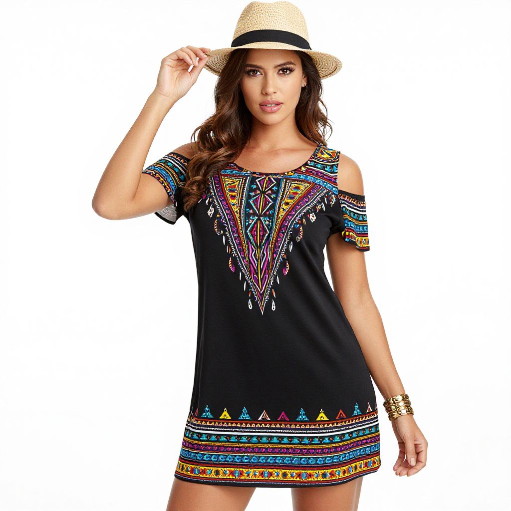 "Woman, boho chic, black mini dress with multicolored tribal-inspired print, short cold-shoulder sleeves, ruffle accents, round neckline, shift silhouette, bordered hemline with contrasting print, straw fedora hat with black ribbon, gold bracelet, white background.. Sexy. Pretty face and beаutiful eyes. Big breasts."