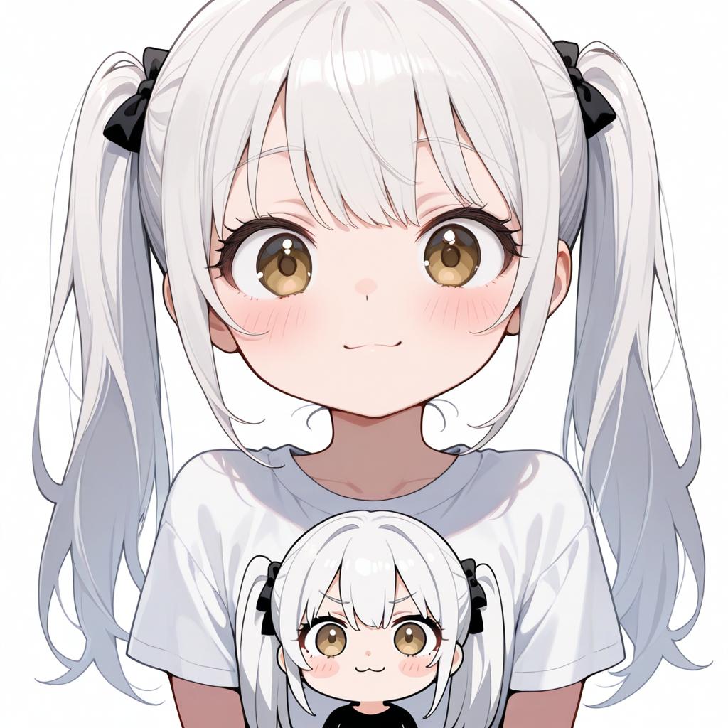 Digital anime-style illustration of a young girl with long white hair styled in twintails tied with black ribbons. She has large brown eyes with prominent eyelashes, a wide-eyed expression, and blush on her cheeks. The girl is wearing a white t-shirt featuring a smaller chibi version of herself with a similar facial expression on the front. The background is plain white.