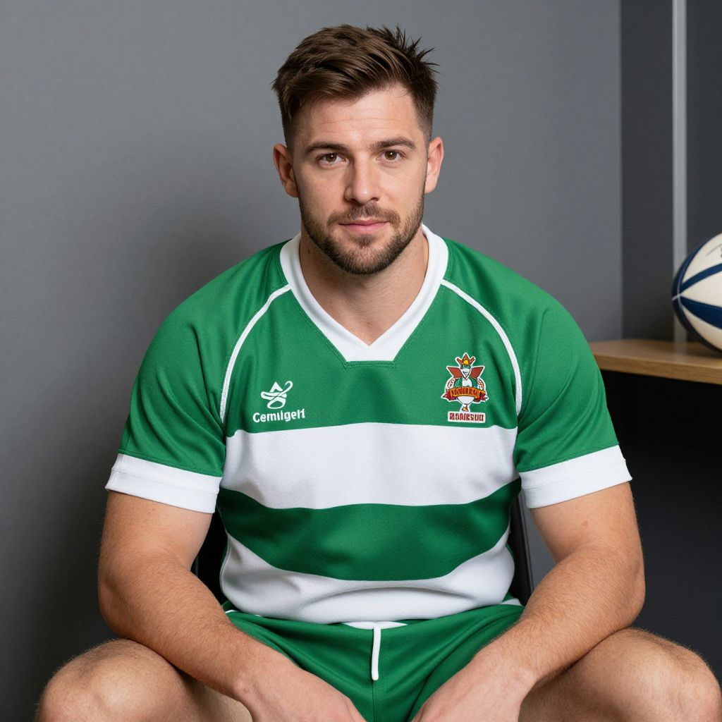Photograph of a muscular, Caucasian man with short brown hair and a trimmed beard, sitting against a gray wall. He wears a green and white rugby uniform with white trim, featuring a crest and "Connacht" logo on the left chest. His green shorts match the top. His expression is neutral, with a slight smile. He sits with legs slightly apart, hands resting on his thighs. A wooden shelf with a black-and-white rugby ball is partially visible in the background on the right. The lighting is even, highlighting his athletic build and the vibrant colors of his uniform.