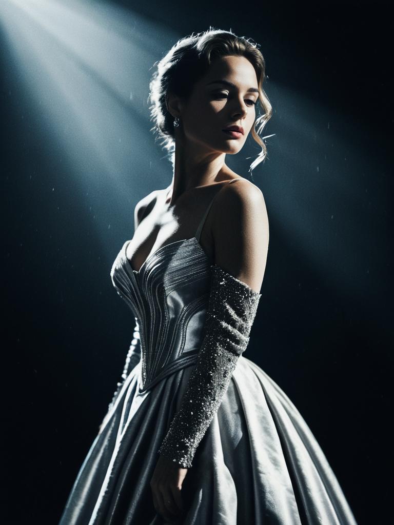 Woman in Silver Gown, photorealistic fashion portrait, cinematic realism