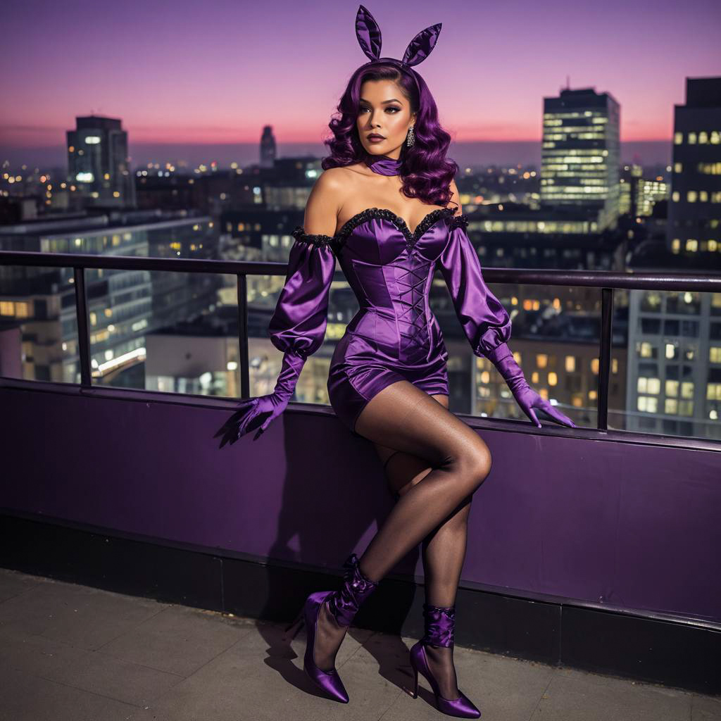Woman in Aubergine Satin Bunny Outfit on Rooftop