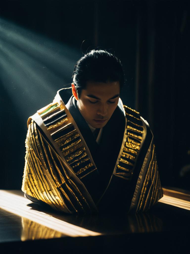 Photorealistic portrait of a person wearing a costume inspired by a sushi roll, featuring golden and black decorative elements. The individual, with dark hair tied back, is illuminated by a focused beam of natural light against a dark background, creating a dramatic effect.
