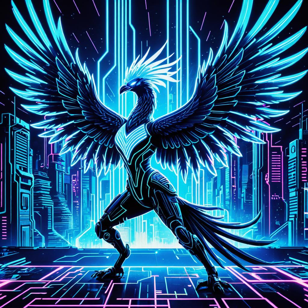A radiant neon phoenix in a dynamic pose in a retro-futuristic synthwave cyberpunk neon paradise in style, crisp electric blue lighting, glowing circuit board metropolis, art, illustrated, stylized.