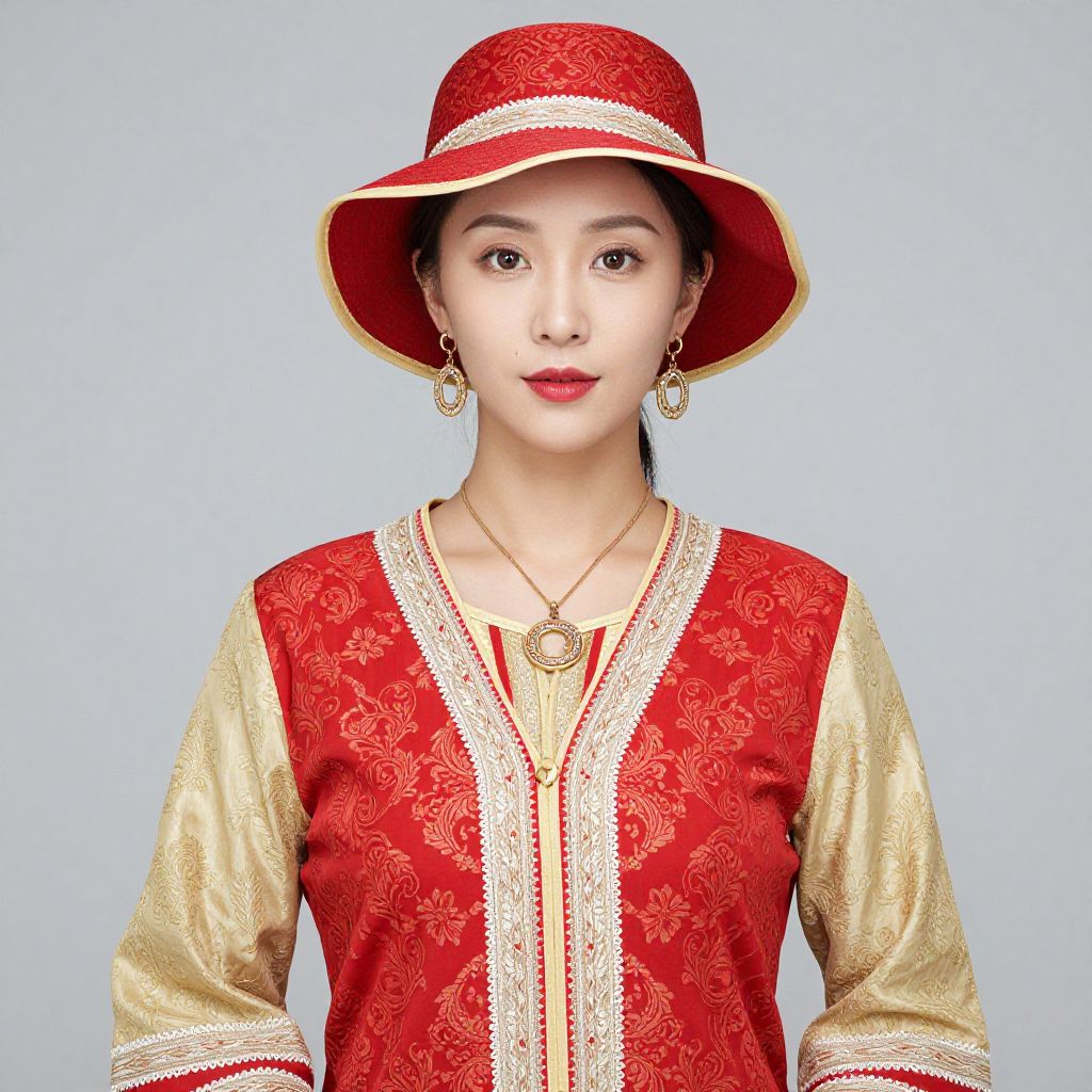 A woman is wearing a red and gold outfit with a matching hat and earrings. The outfit has a red background with a patterned design and a white border. The woman is also wearing a necklace with a circular pendant.