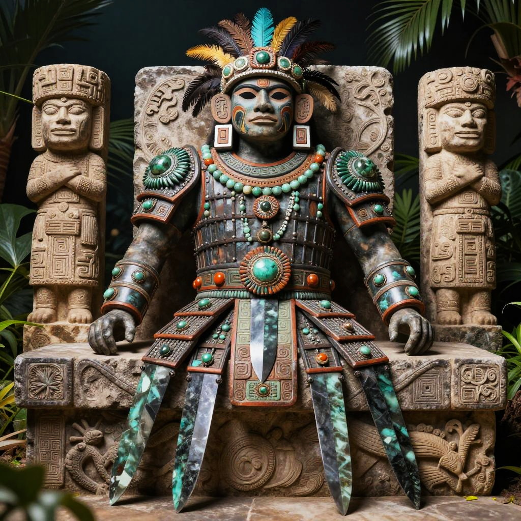 Real Aztec armor displayed on a warrior in a lush jungle setting, intricate feathered headdress, vibrant colors, detailed gold and turquoise adornments, traditional patterns on leather scales, sunlight filtering through dense foliage, dynamic action pose.