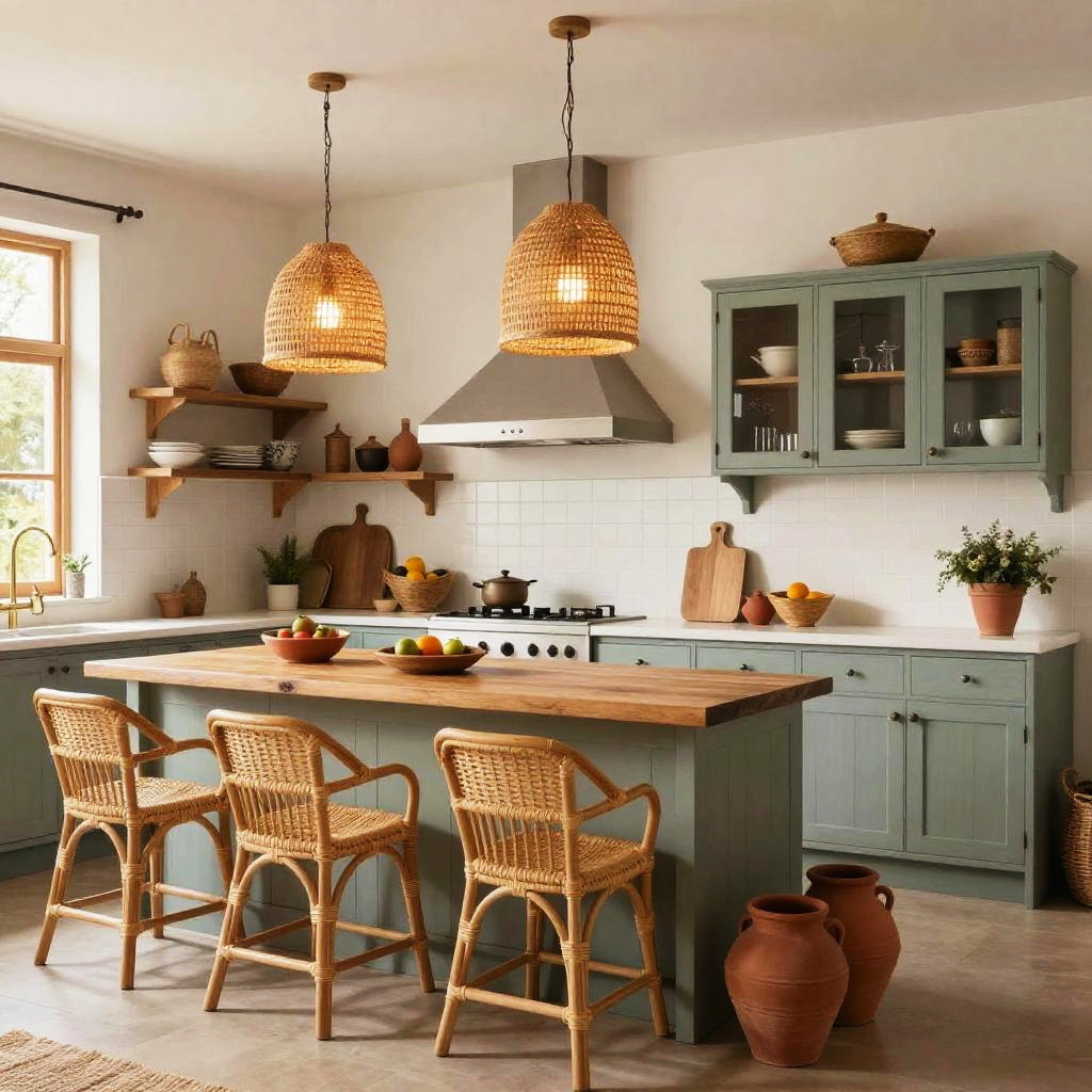 Bohemian kitchen design showcasing a mix of rattan furniture, woven baskets, terracotta pots, hand-painted cabinets, pendant lights with woven shades, an inviting, artistic space full of character
