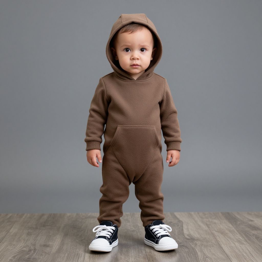 Baby carters costume, solo, male focus, 1boy, standing, shoes, full body, hood, realistic, hood up, sneakers
