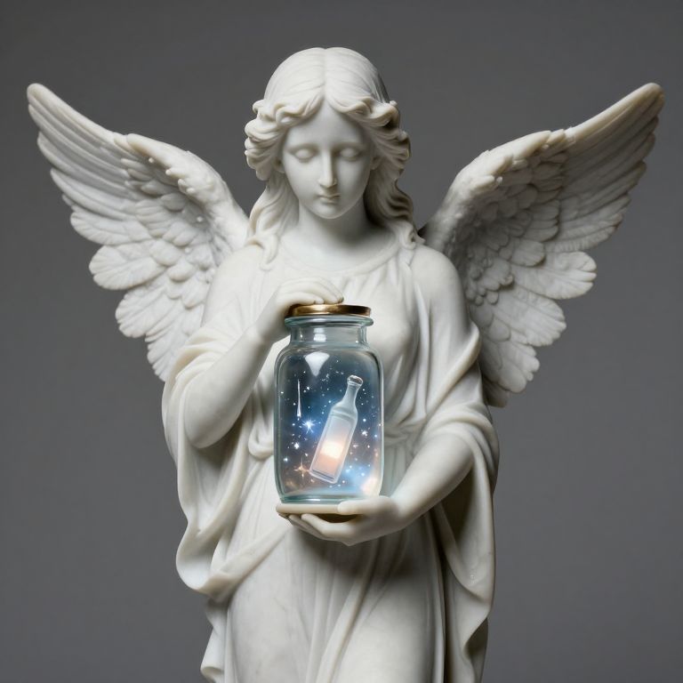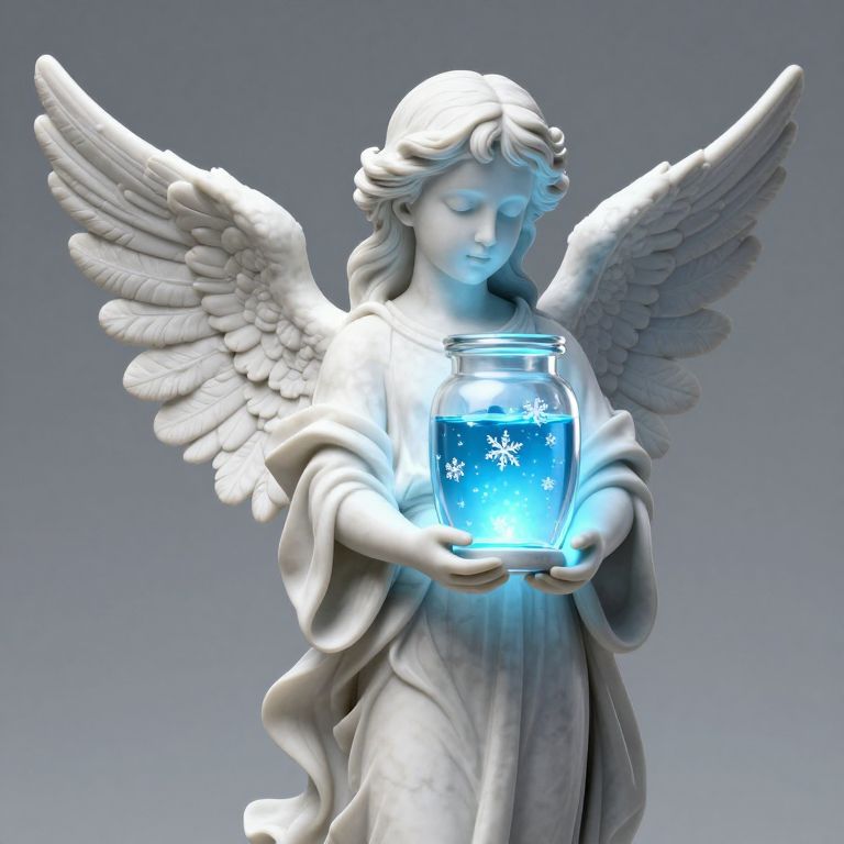 A 3D-rendered marble statue of a serene angel, adorned with intricate wings and flowing robes, cradles a glowing glass jar filled with ethereal blue liquid and floating snowflakes, evoking a sense of timeless wonder and celestial beauty.