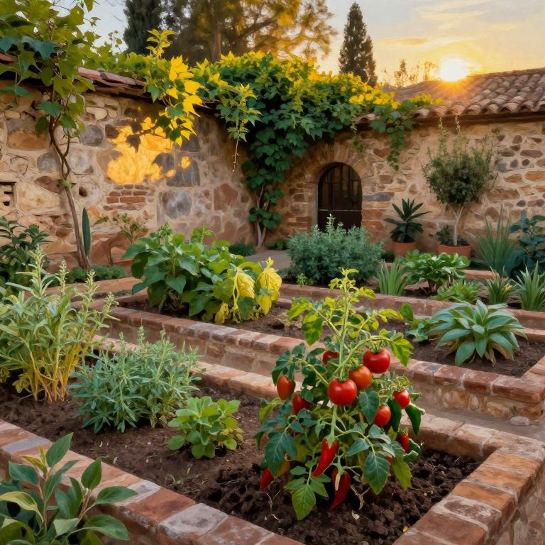Huerta traditional Spanish garden with terraced plots filled with herbs, tomato plants, and peppers, old stone walls with creeping vines, sunset casting golden hues, intricate details on leaves and soil, painterly style blending realism with impressionism.
