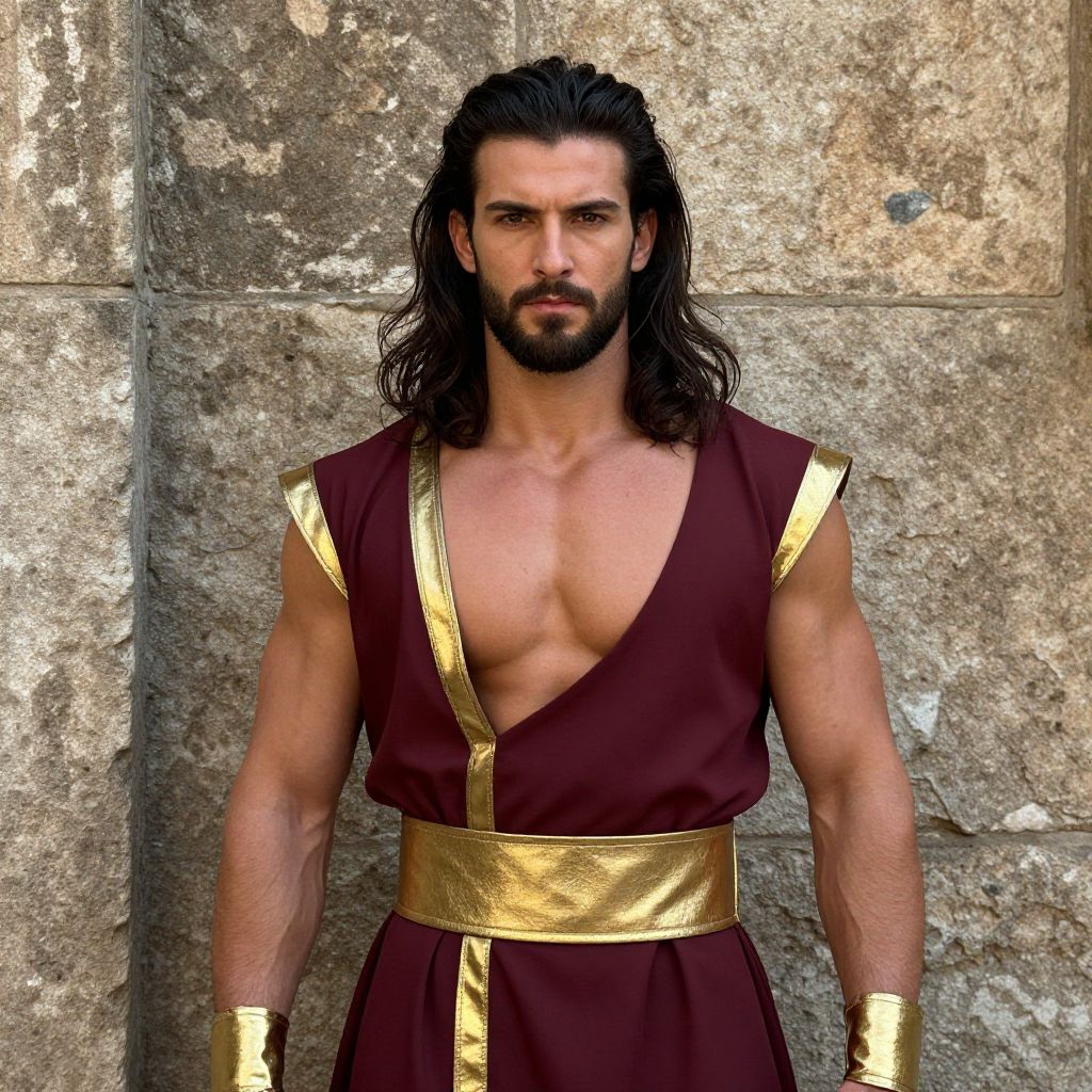 A man with long dark hair and a beard wearing a maroon and gold outfit with a gold belt, standing in front of a stone wall. The man has a muscular build, well-defined features, and a confident expression. His dark hair is styled in a tousled manner, and his beard is neatly trimmed. The maroon and gold outfit is well-fitted, highlighting his athletic physique. The stone wall in the background is weathered and textured, adding a sense of ancient history to the scene. The overall atmosphere is rugged and timeless, emphasizing the man's strength and presence.