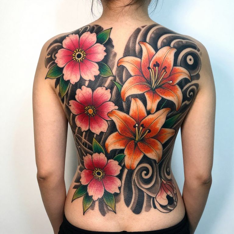 Vibrant Floral Back Tattoo Photography