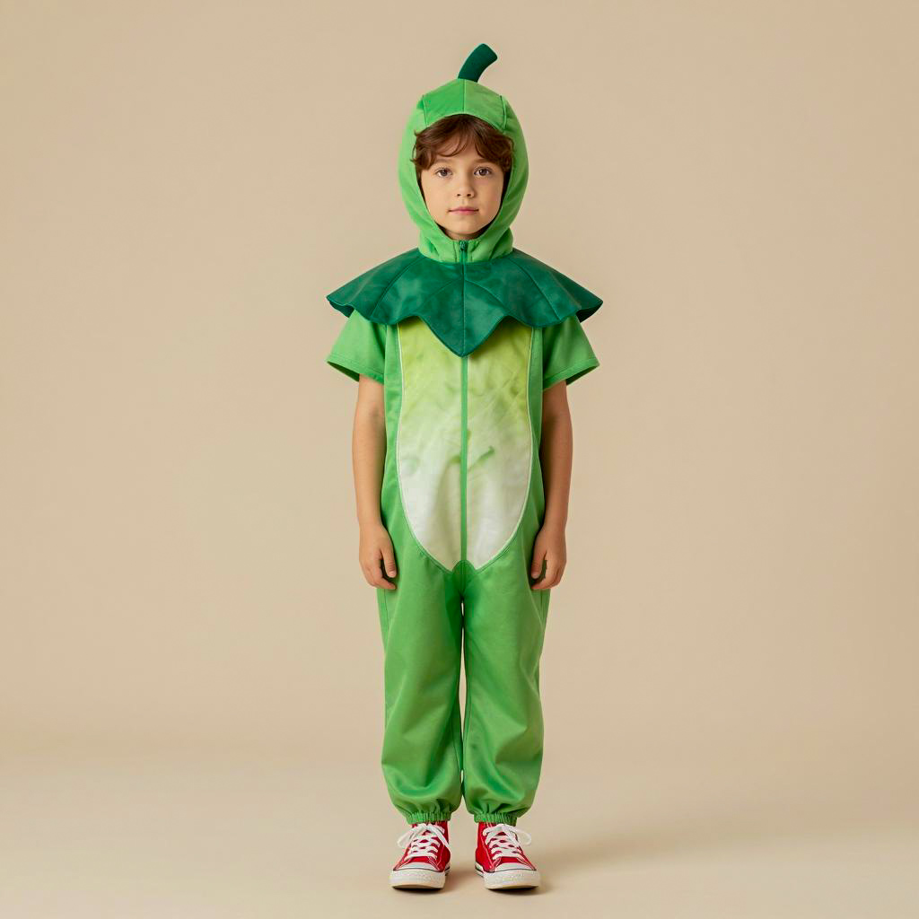 Cucumber fancy dress costume, photograph of a young child wearing a green vegetable costume, full-body costume resembling a leafy green vegetable with a hat, standing against a plain beige background, child wearing red sneakers, short sleeves on costume, child facing forward, neutral expression, soft lighting, costume details include green leafy ure and a small green stem on top, no additional objects or people in the background