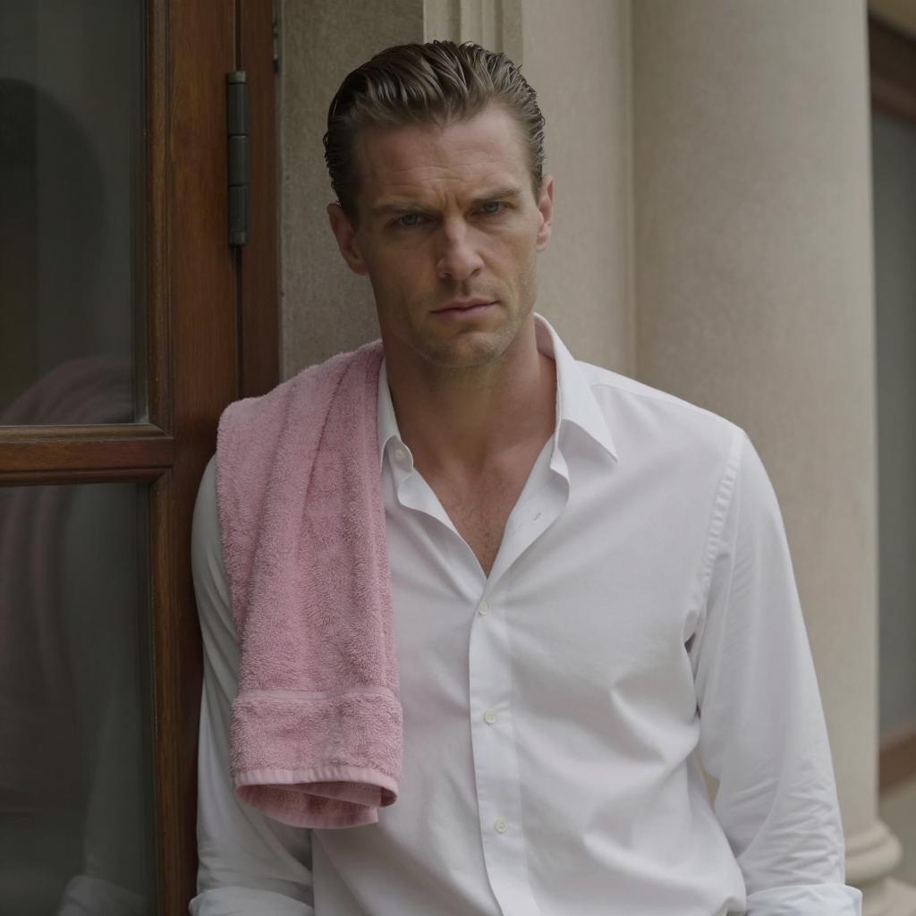 A man with short, slicked-back brown hair standing in a dimly lit room. He wears an unbuttoned white dress shirt, exposing his chest, with a pink ured towel draped over his left shoulder. He leans against a wooden door with a glass pane on the left. The background includes a stone column. The man has a serious expression.