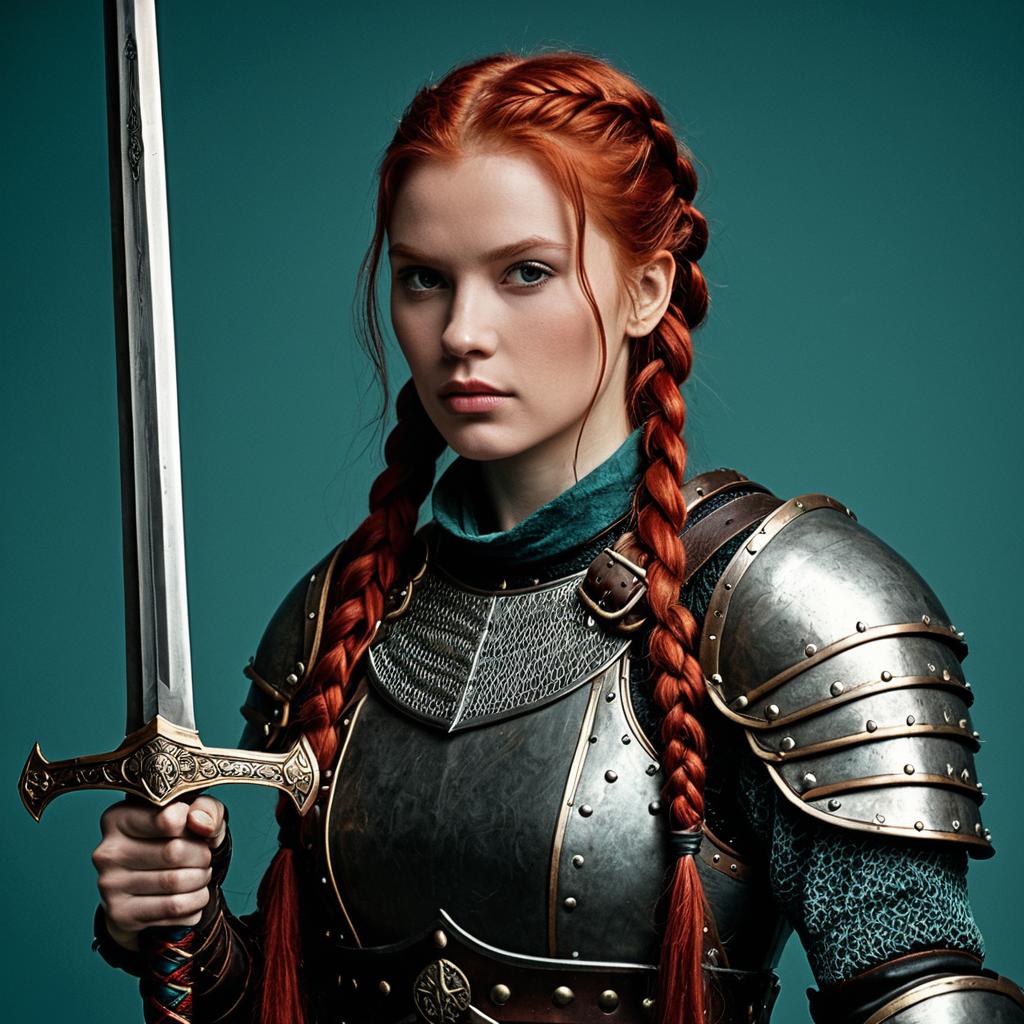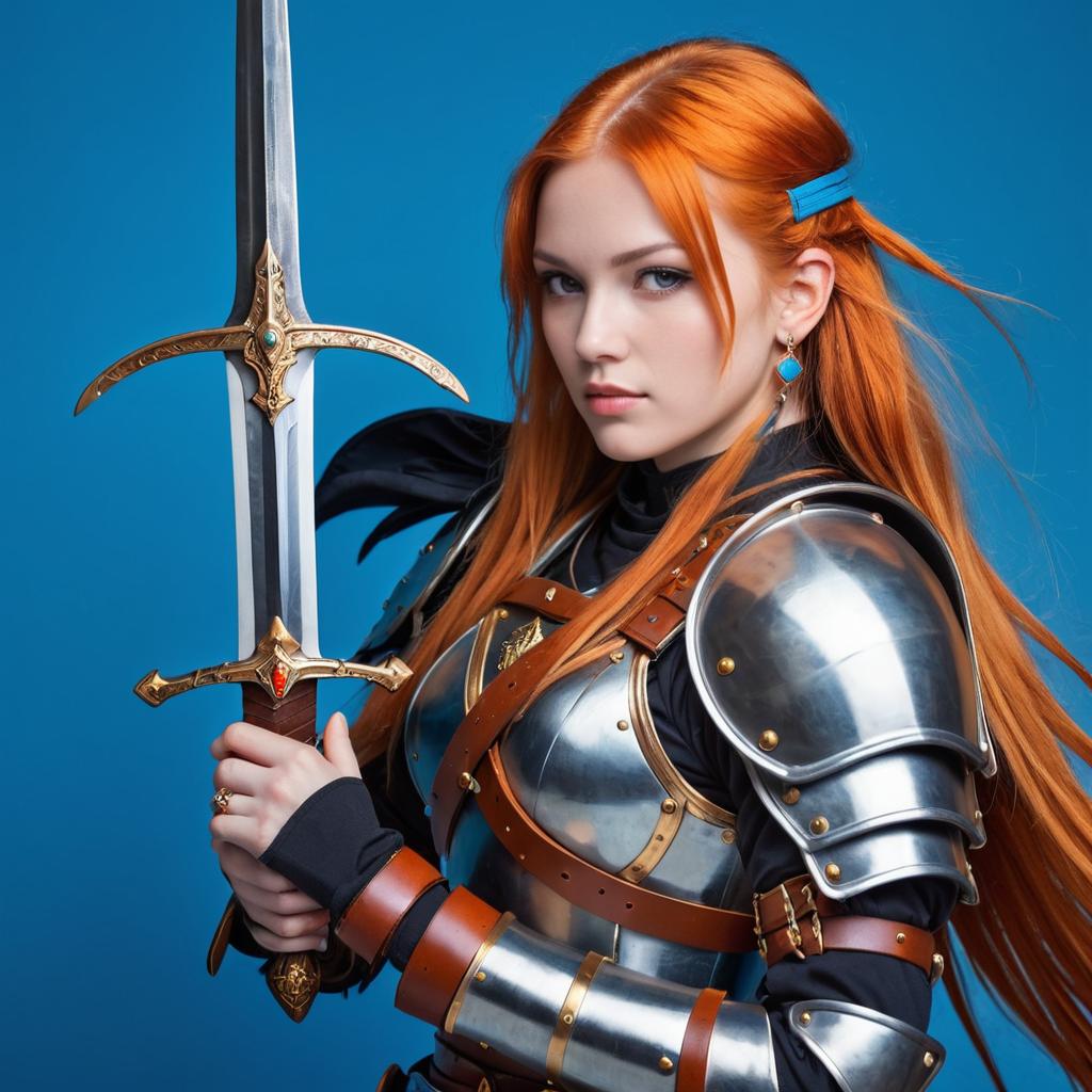 1girl, weapon, solo, sword, holding, holding weapon, armor, holding sword, long hair, looking at viewer, freckles, jewelry, earrings, belt, from side, shoulder armor, blue eyes, orange hair, pauldrons, eyepatch, blue background, blonde hair, lips, upper body, closed mouth
