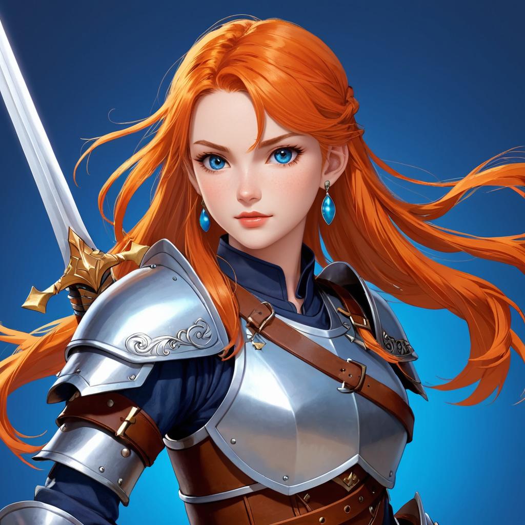 Portrait of a young red-haired woman wearing silver medieval armor with leather straps, holding a decorative sword with gold accents, standing against a blue background. She has striking blue eyes, long straight hair with a blue hair clip, and is wearing blue earrings. The image captures the upper body with a focused and intense facial expression.