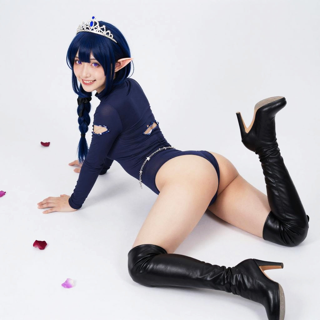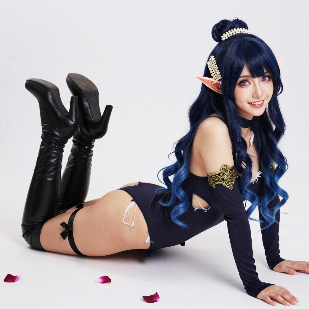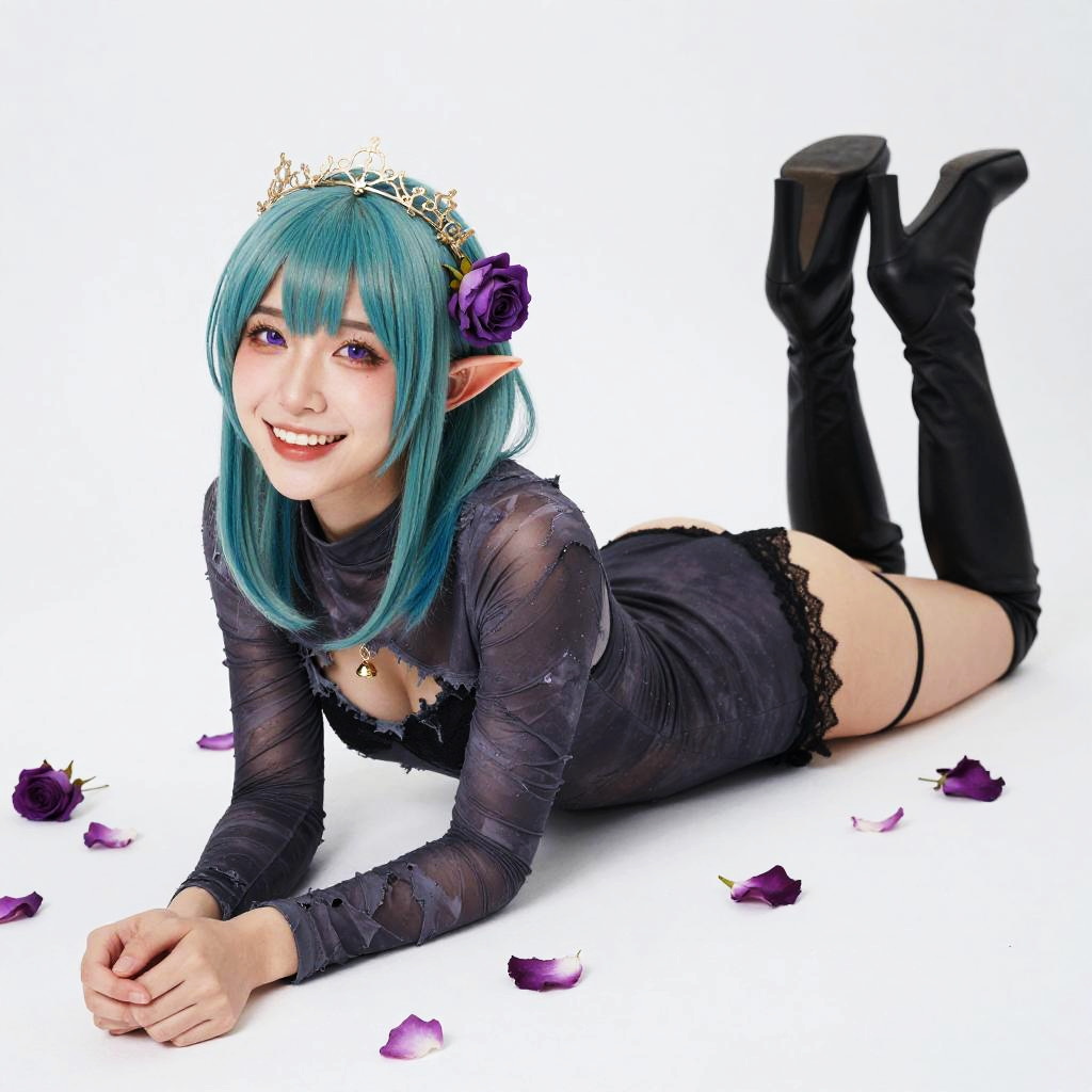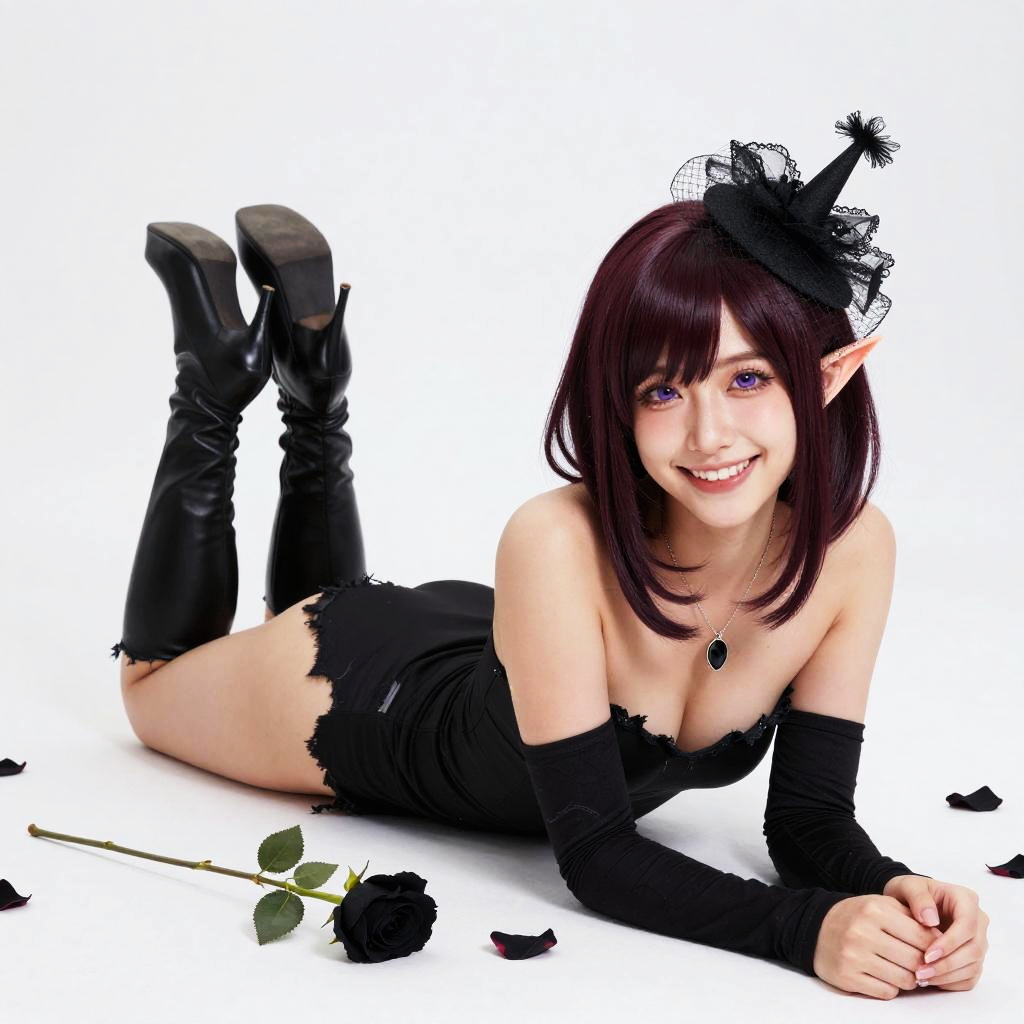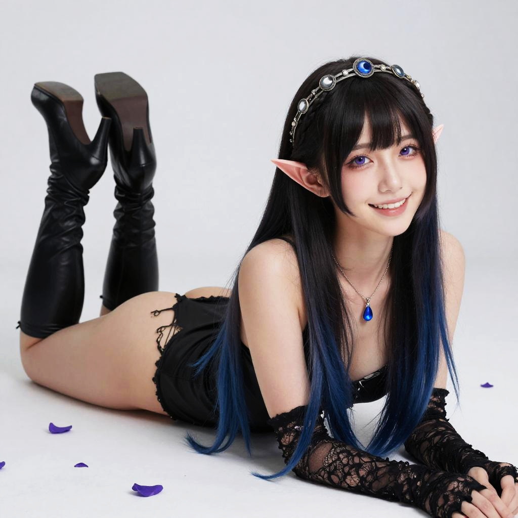 Portrait of a smiling Asian woman with pointy elf ears and long, wavy hair featuring a subtle midnight-blue ombre. She is lying on her stomach wearing a black torn bodysuit, high heeled black boots, and accessorized with an antique smoky quartz lariat necklace, onyx chain waist harness, and a blood-red silk rose pinned to her hip. The white background is scattered with red rose petals.