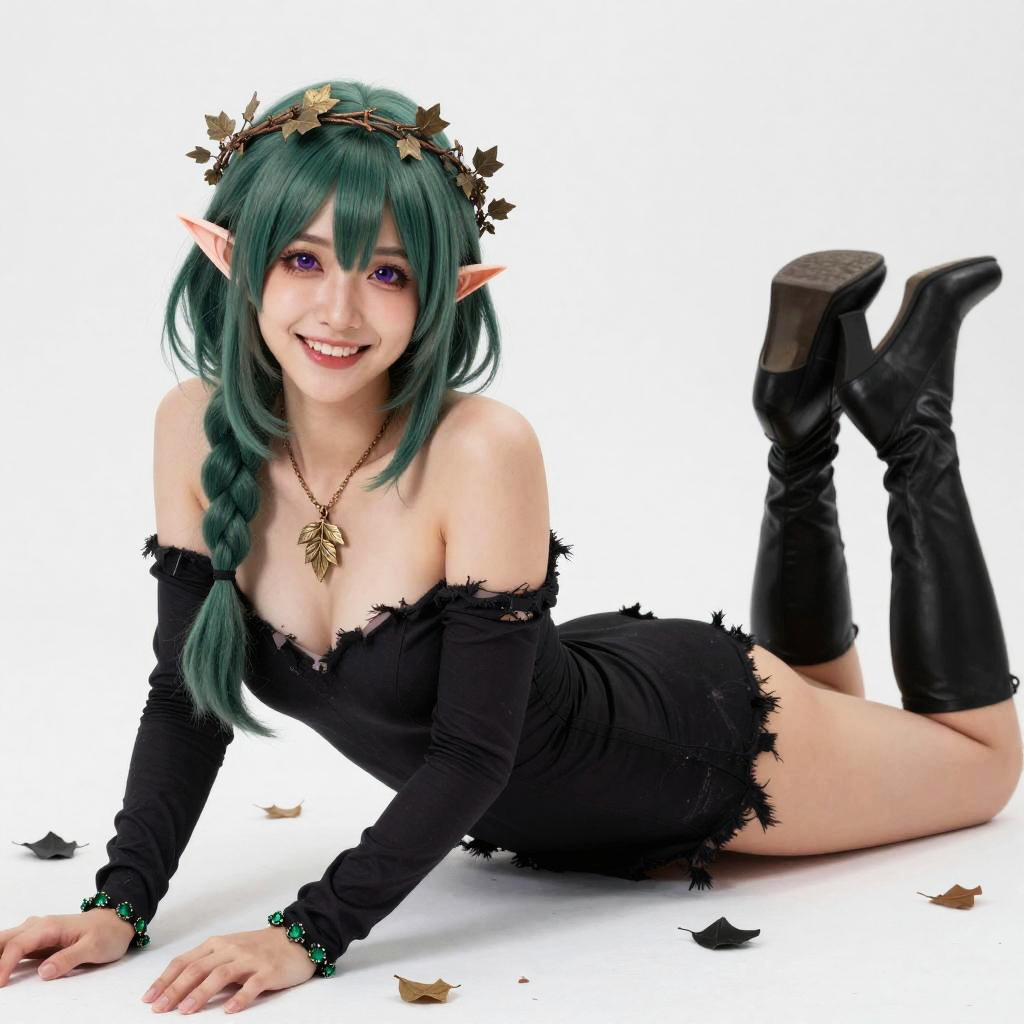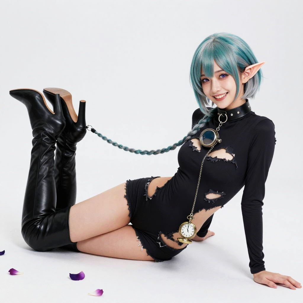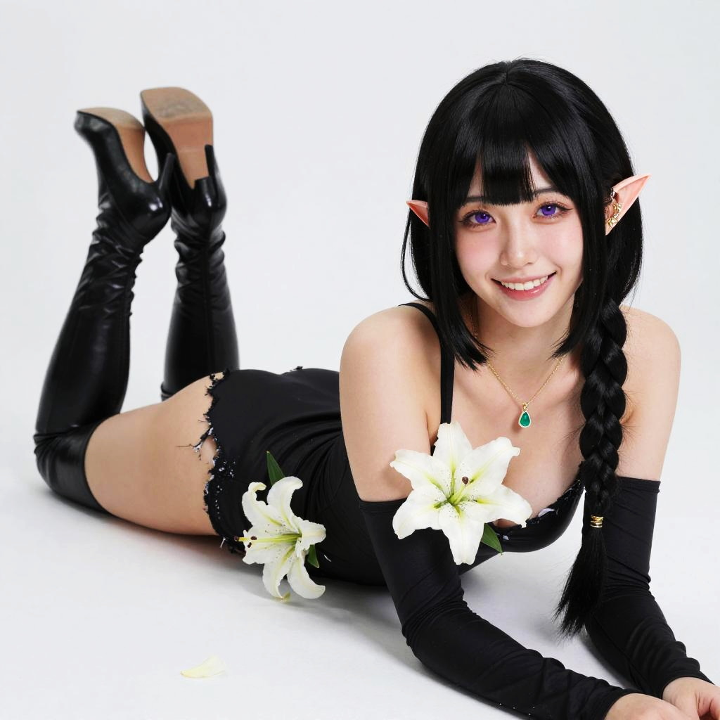 1girl, solo, half-up double fishtail braids with waist-length loose waves, pointy ears, high heels, boots, smile, purple eyes, torn clothes, looking at viewer, breasts, high heel boots, antique smoky quartz lariat necklace, on side, delicate onyx chain waist harness, ass, lying, petals, black footwear, bodysuit, waist-length loose waves with subtle midnight-blue ombre, blood-red silk rose pinned to left hip strap, long sleeves, grin, full body