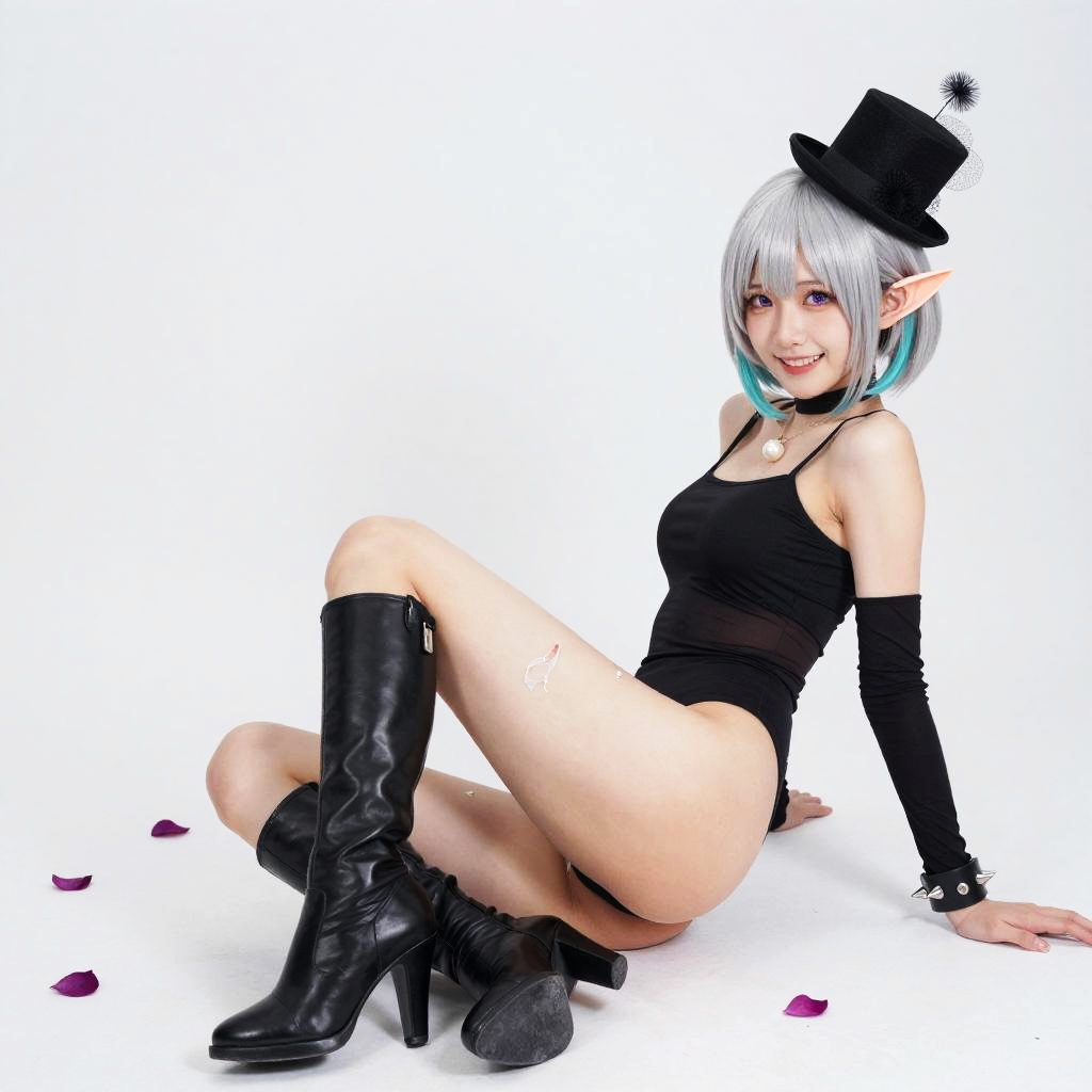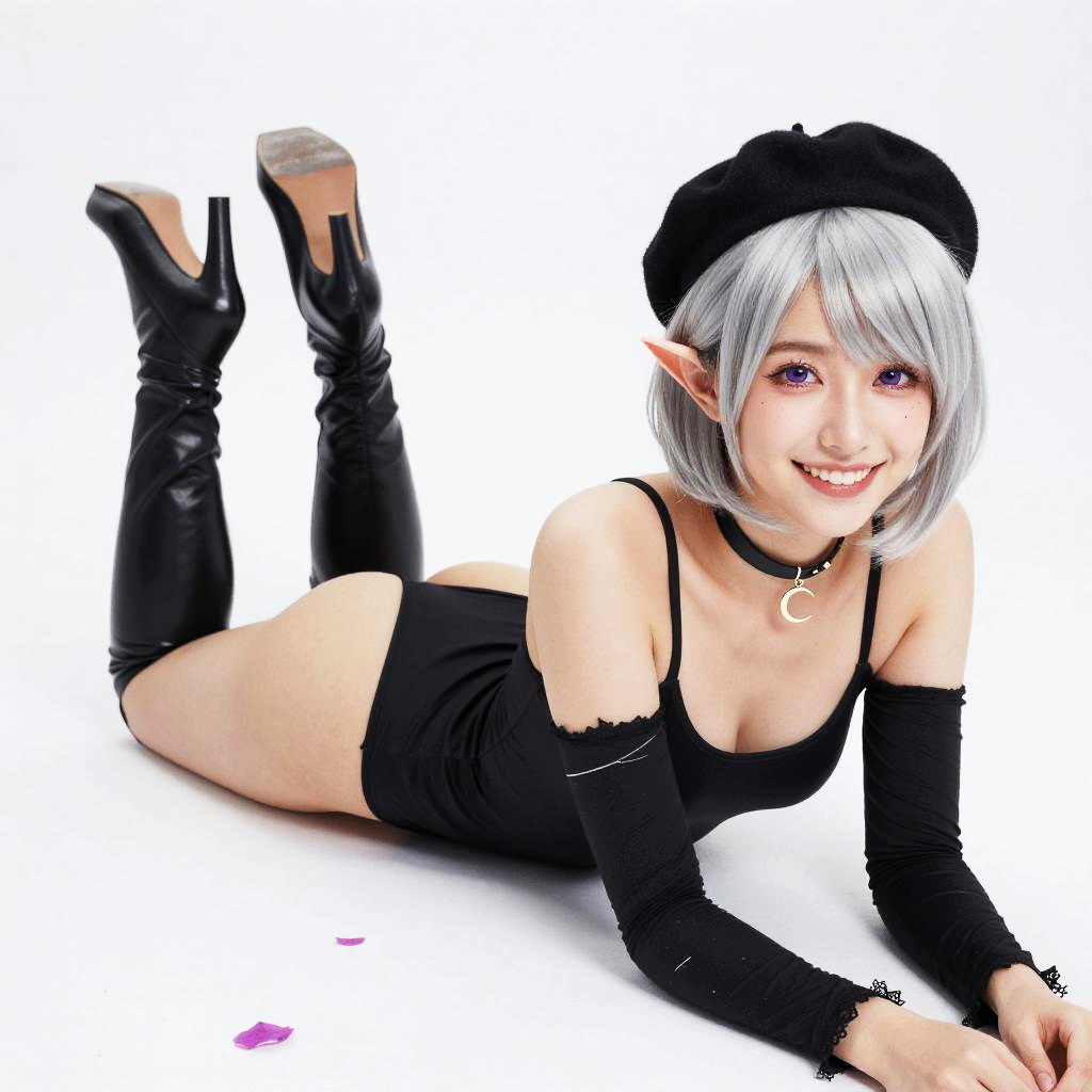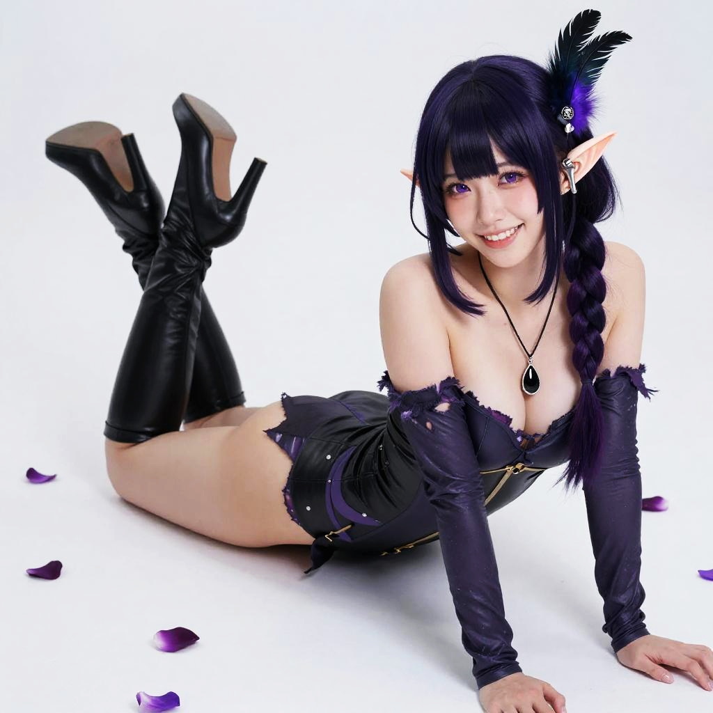 1girl, solo, half-up double fishtail braids with waist-length loose waves, pointy ears, high heels, boots, smile, purple eyes, torn clothes, looking at viewer, breasts, high heel boots, antique smoky quartz lariat necklace, on side, delicate onyx chain waist harness, ass, lying, petals, black footwear, bodysuit, waist-length loose waves with subtle midnight-blue ombre, blood-red silk rose pinned to left hip strap, long sleeves, grin, full body