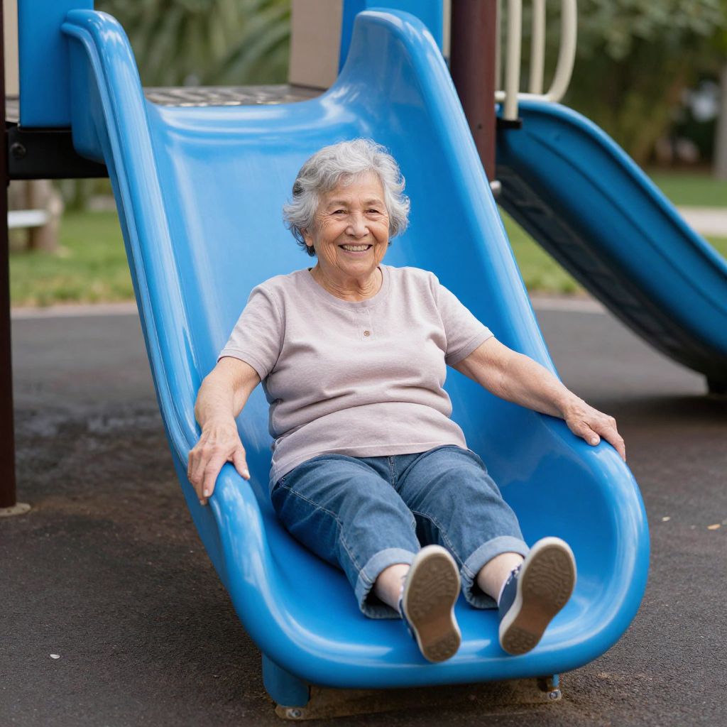 An elderly woman slides down a vibrant blue slide with a radiant smile, embodying the timeless spirit of joy and youthful exuberance amidst the serene embrace of nature.