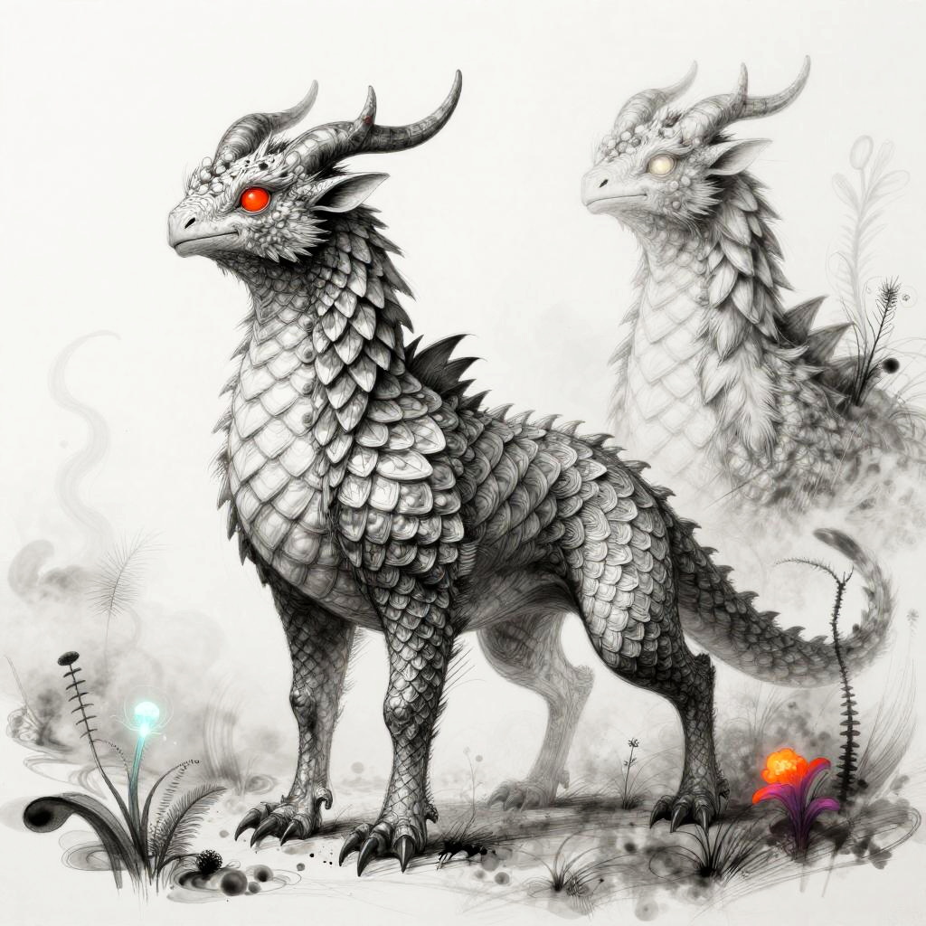 Free AI sketch generator conceptualizing fantasy creatures with fluid and imaginative line work, detailed scales and feathers, surreal environments with ethereal fog and glowing plants, monochrome with splashes of vibrant color highlighting key features.