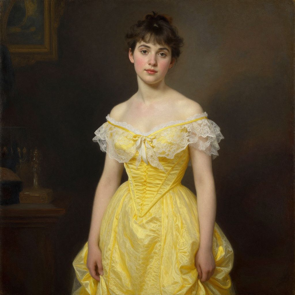 Victorian-style oil painting of a young woman with fair skin, dark hair, and delicate features, wearing a yellow off-the-shoulder dress with