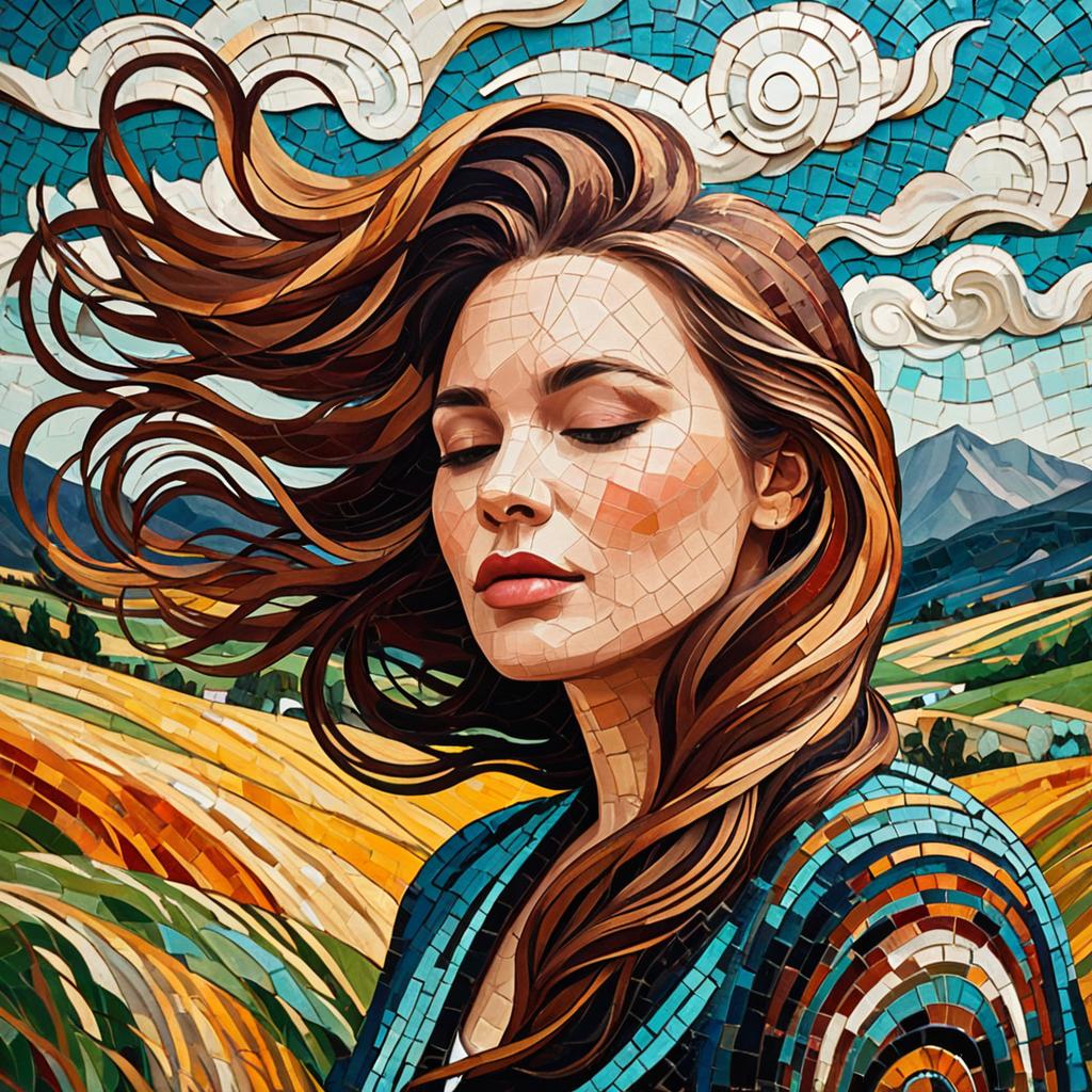 Colorful, stylized portrait of a woman with vibrant bronze hair flowing in the wind, eyes closed in a serene expression. Painted in a swirling, mosaic-like style with bold, swirling brushstrokes. Background features an abstract, dynamic landscape with rolling fields and distant mountains, under a sky with expressive, swirling clouds. Warm tones create a sense of harmony and connection to nature.