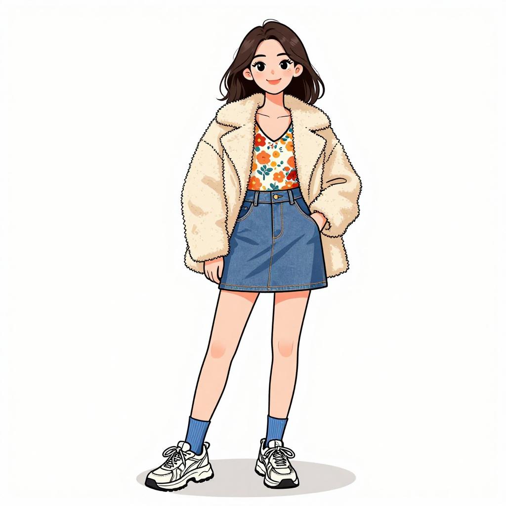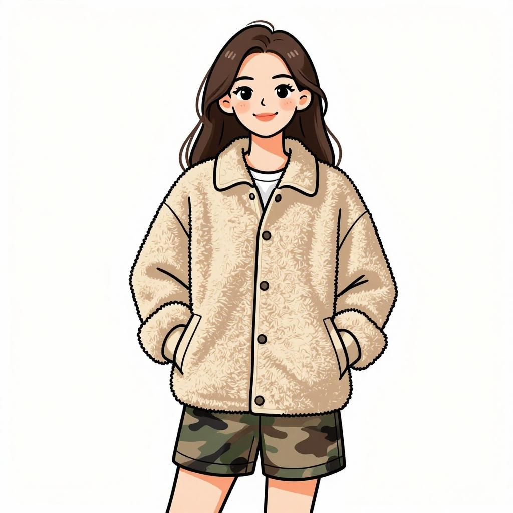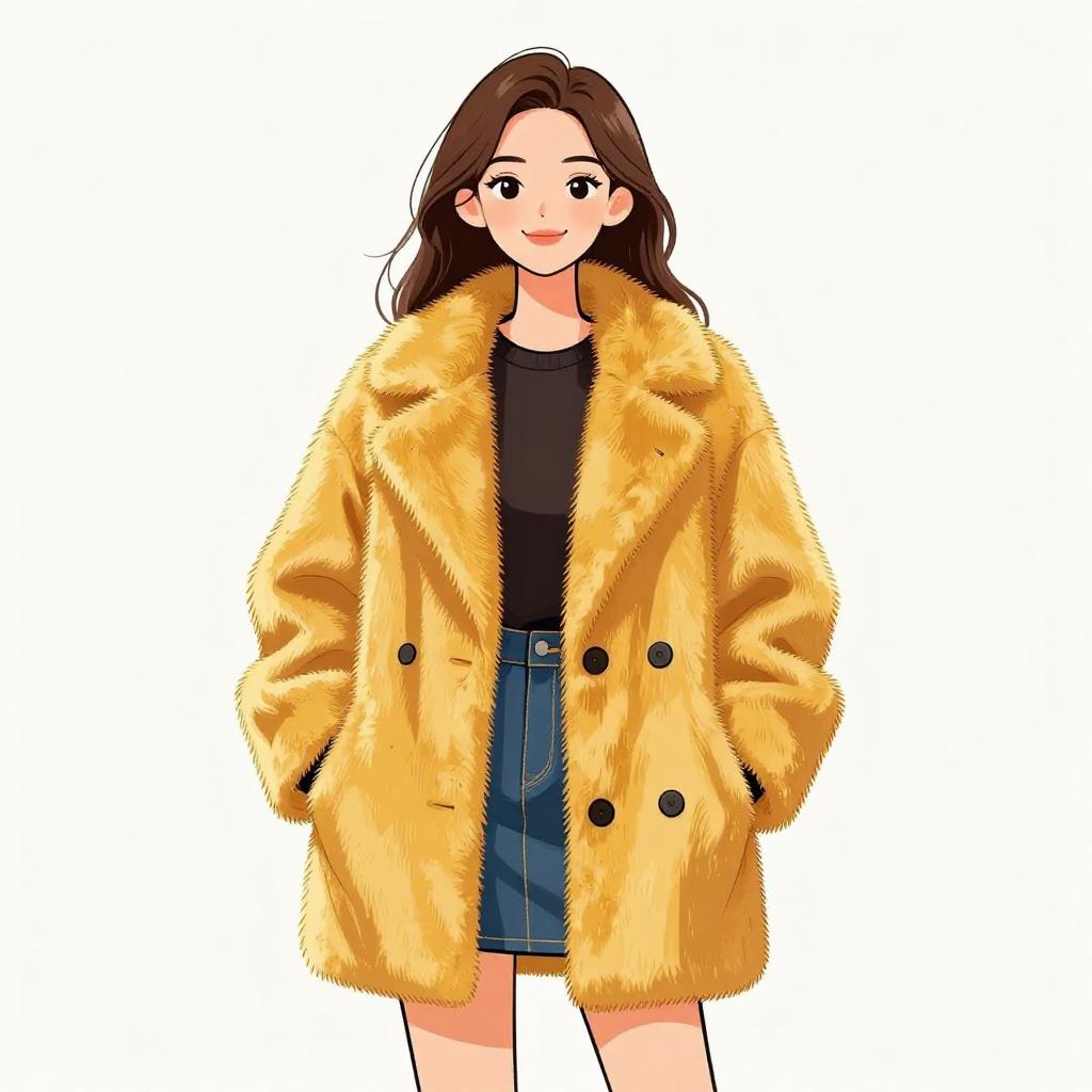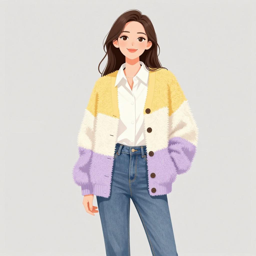 Woman with pretty face and pretty hair. smiling Woman, casual chic, oversized fuzzy color-blocked jacket in pastel yellow, white, and lavender, drop shoulder, wide lapels, button front, light-wash denim jeans, tapered leg, white button-up shirt, relaxed fit, collar visible over the jacket, minimalist makeup, photo studio background. --sref 1467