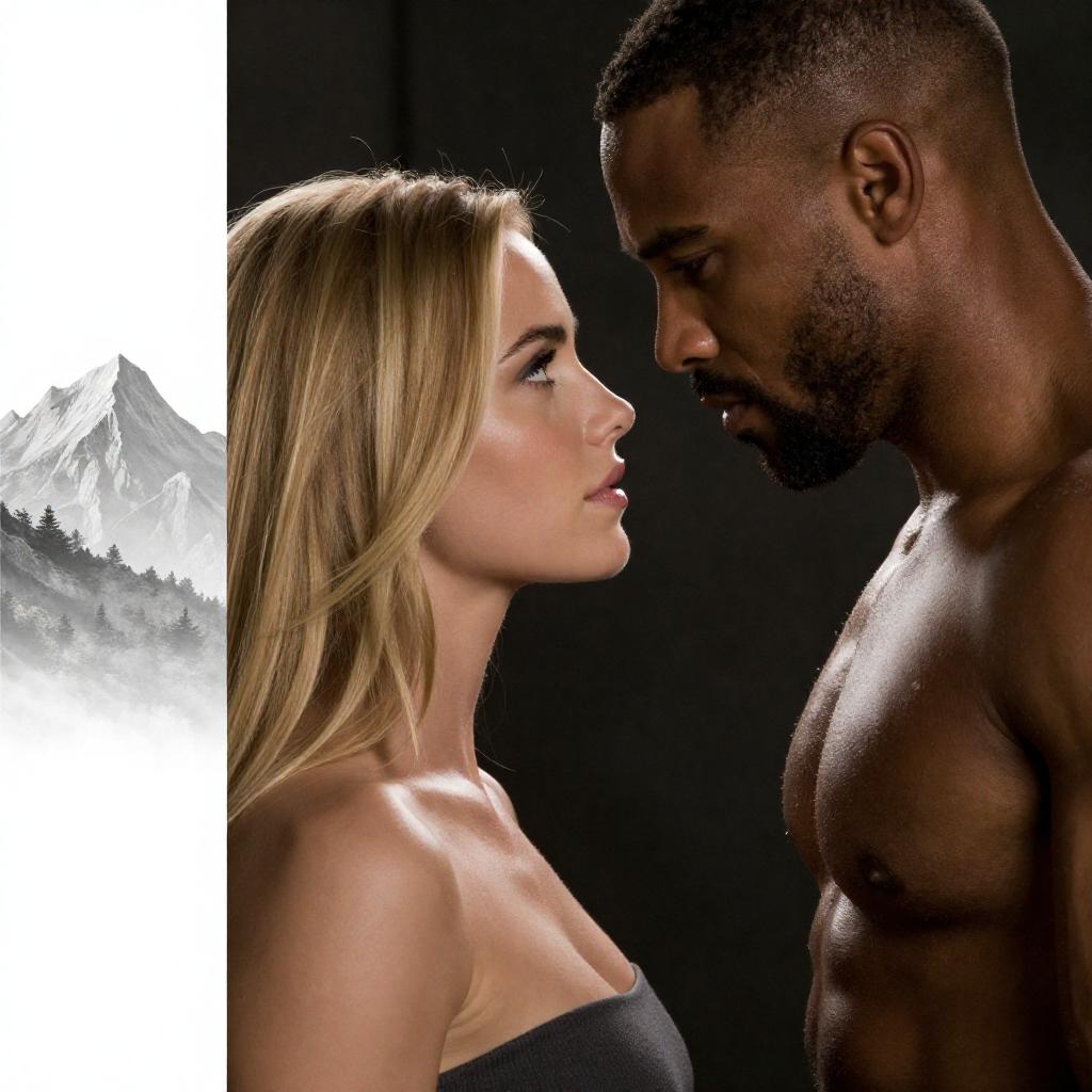 Photograph of a serious, muscular dark-skinned man with a short beard leaning closely towards a blonde woman with long hair wearing a strapless top. The background is dark and blurred with a monochrome mountain illustration on the left side of the image.