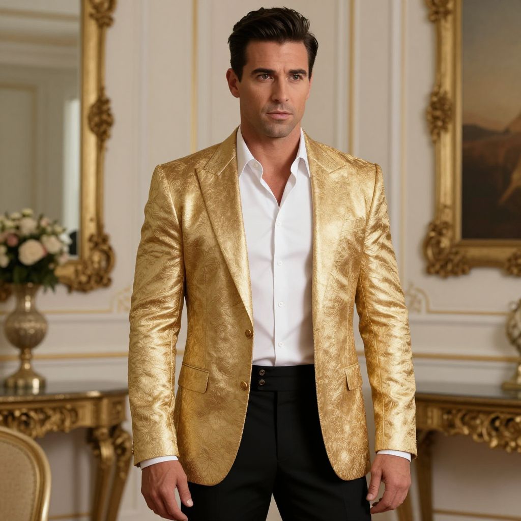 Man Celebrity Costume, man in a golden jacket and white shirt standing in a room