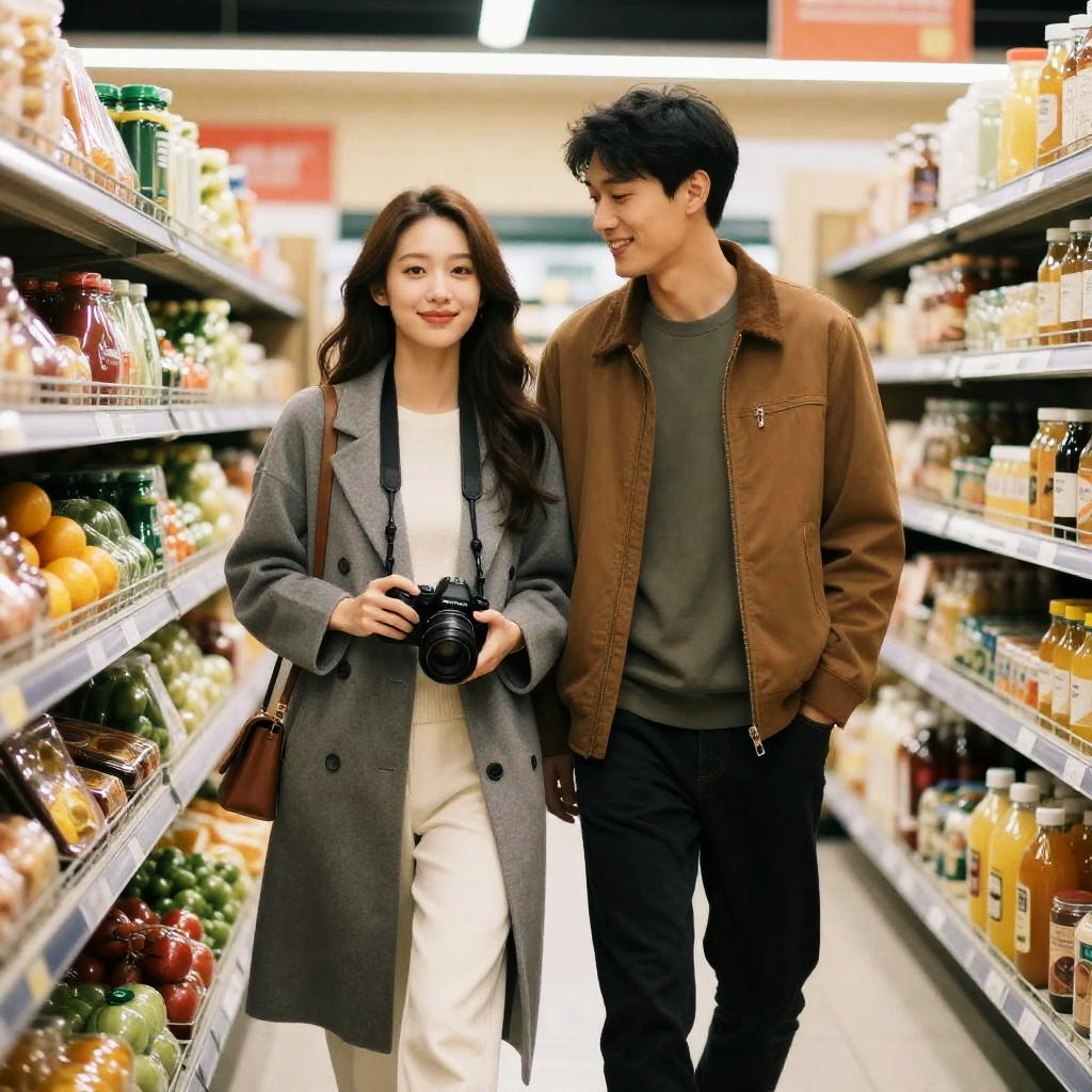 Photograph of a couple in a grocery store aisle. Woman with long brown wavy hair, gray coat, white pants, holding a camera. Man with short black hair, brown jacket, green shirt, dark pants, smiling at her. Shelves with colorful produce and packaged goods in background. Woman looking at camera, man looking at her. Both standing close together.