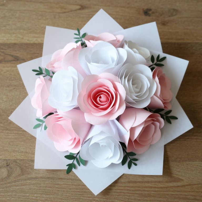 Handcrafted paper flowers in soft pink and white hues, intricately detailed with gold centers and green leaves, are elegantly bundled with a white ribbon, showcasing a DIY wedding bouquet by DHL Florist.