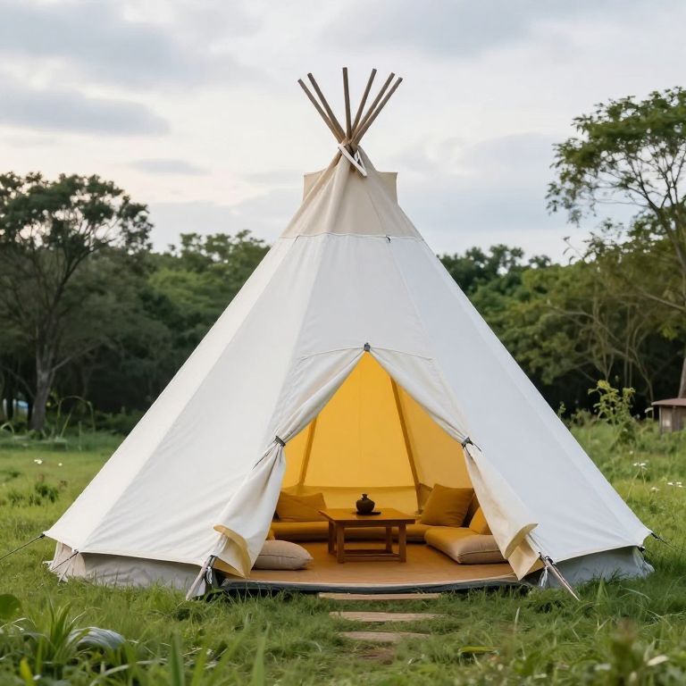 Lush green grass surrounds a pristine white tipi tent with a vibrant yellow interior, featuring a cozy seating area with a wooden table and cushions, set against a backdrop of trees and a partly cloudy sky.