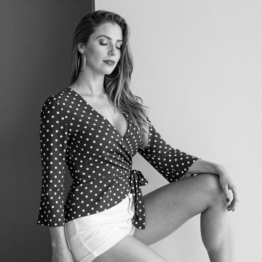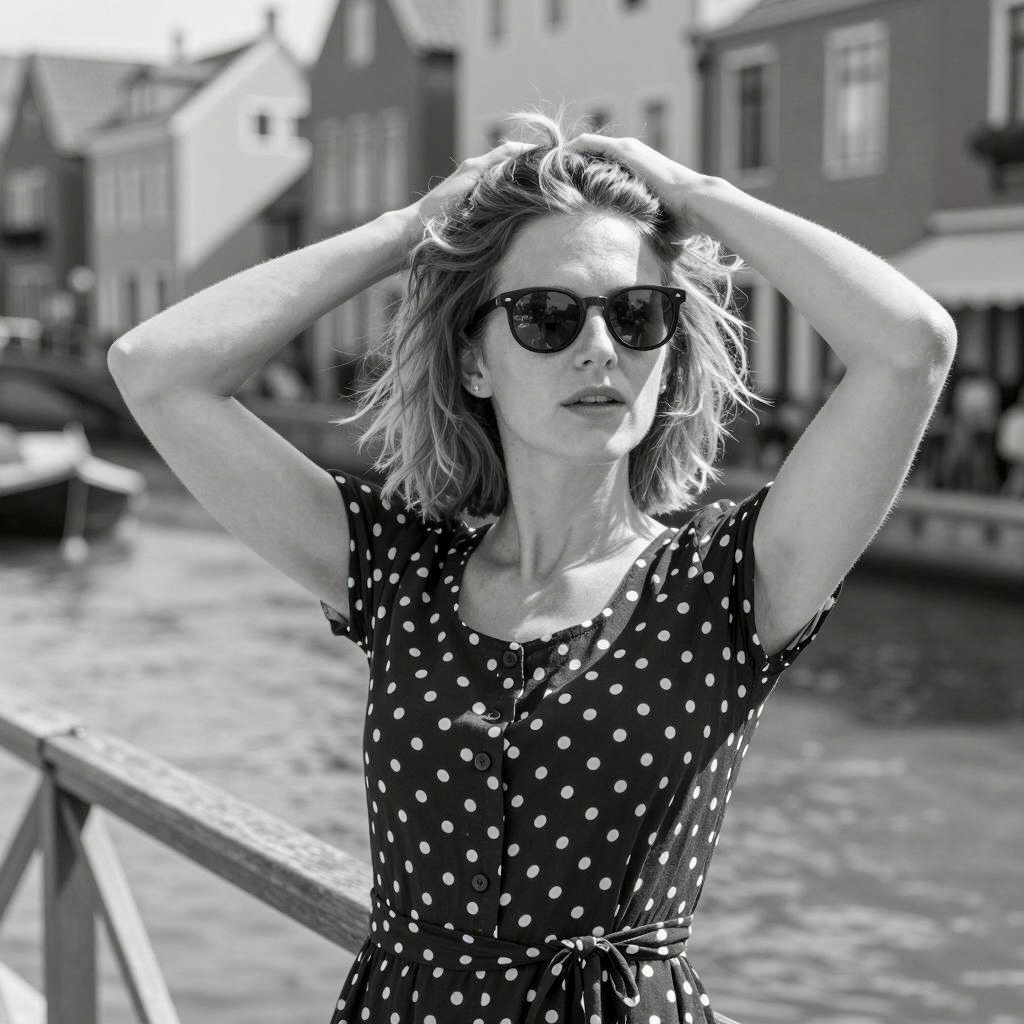 Black and white photo of a woman with light skin and short tousled blonde hair wearing sunglasses and a short-sleeved polka dot dress. She stands near a wooden railing by a canal with blurred buildings in the background, posing with her arms raised and hands touching her head. Sunlight highlights her face.