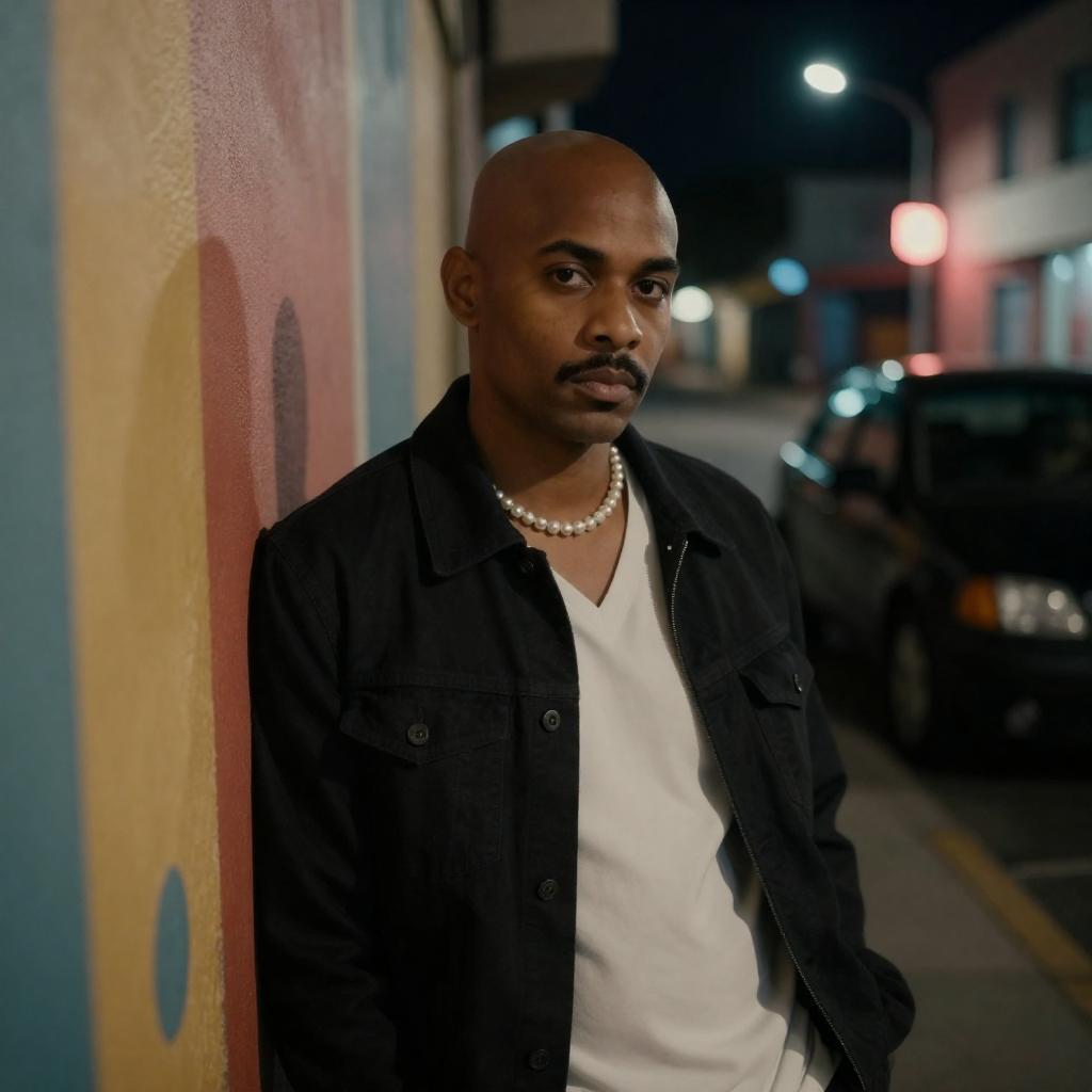 Photograph of a medium-built man with dark skin and short black hair, wearing a black t-shirt and black leather jacket, standing on a sunlit street. He has a mustache and a slight smile. Background includes white and brown buildings, a blue sky, and parked cars.