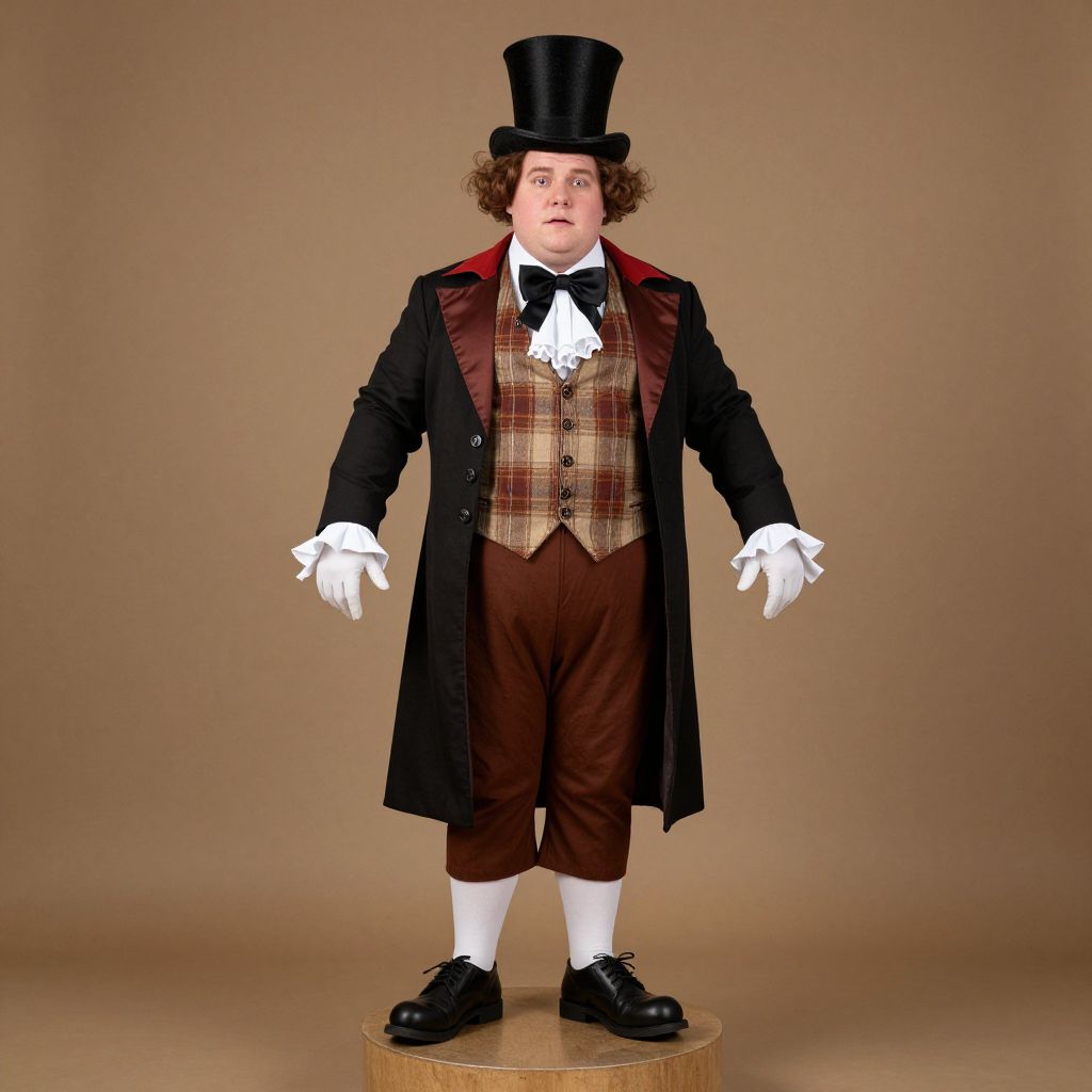 Plus Size Man Mad Hatter Costume, dressed in a top hat and coat standing on a pedestal
