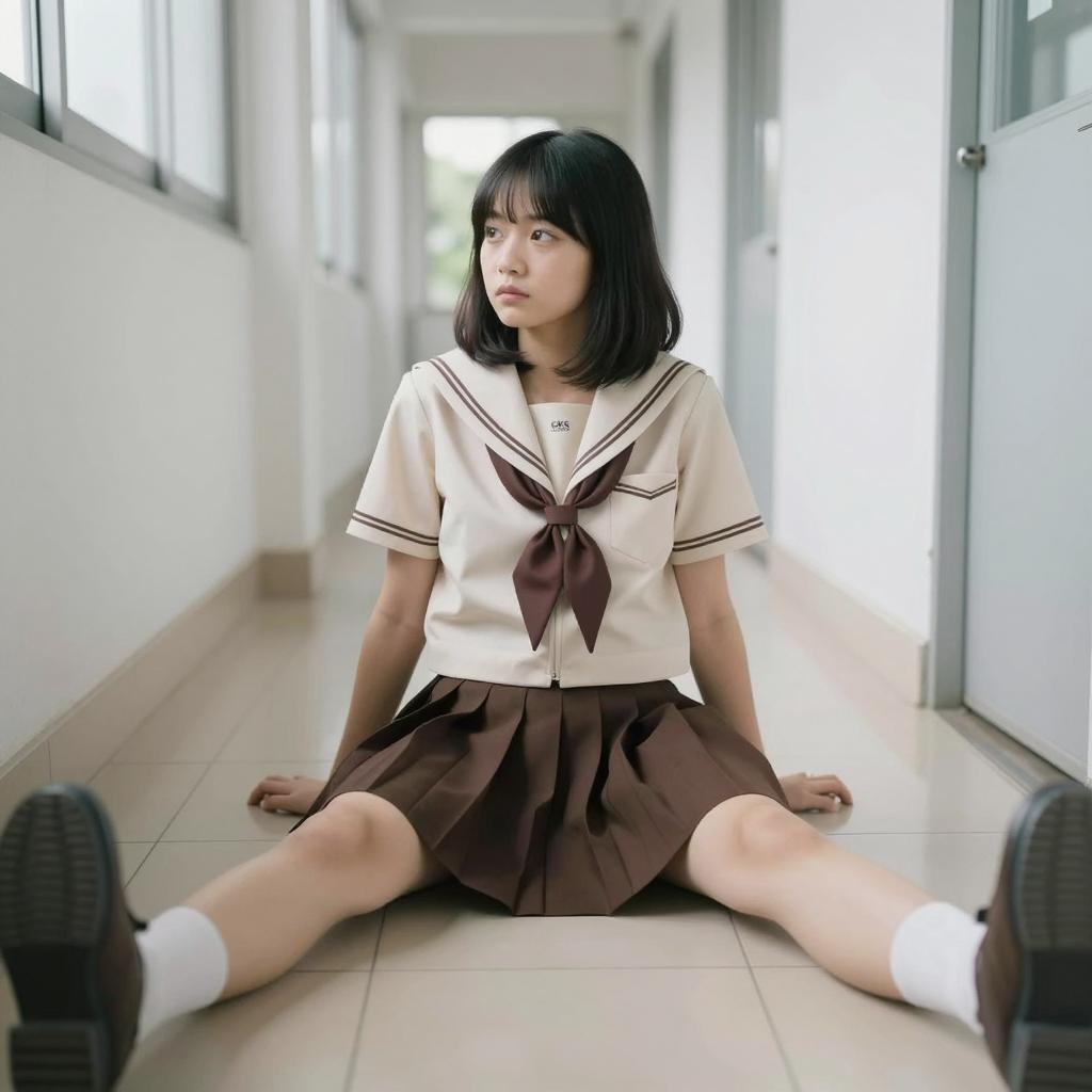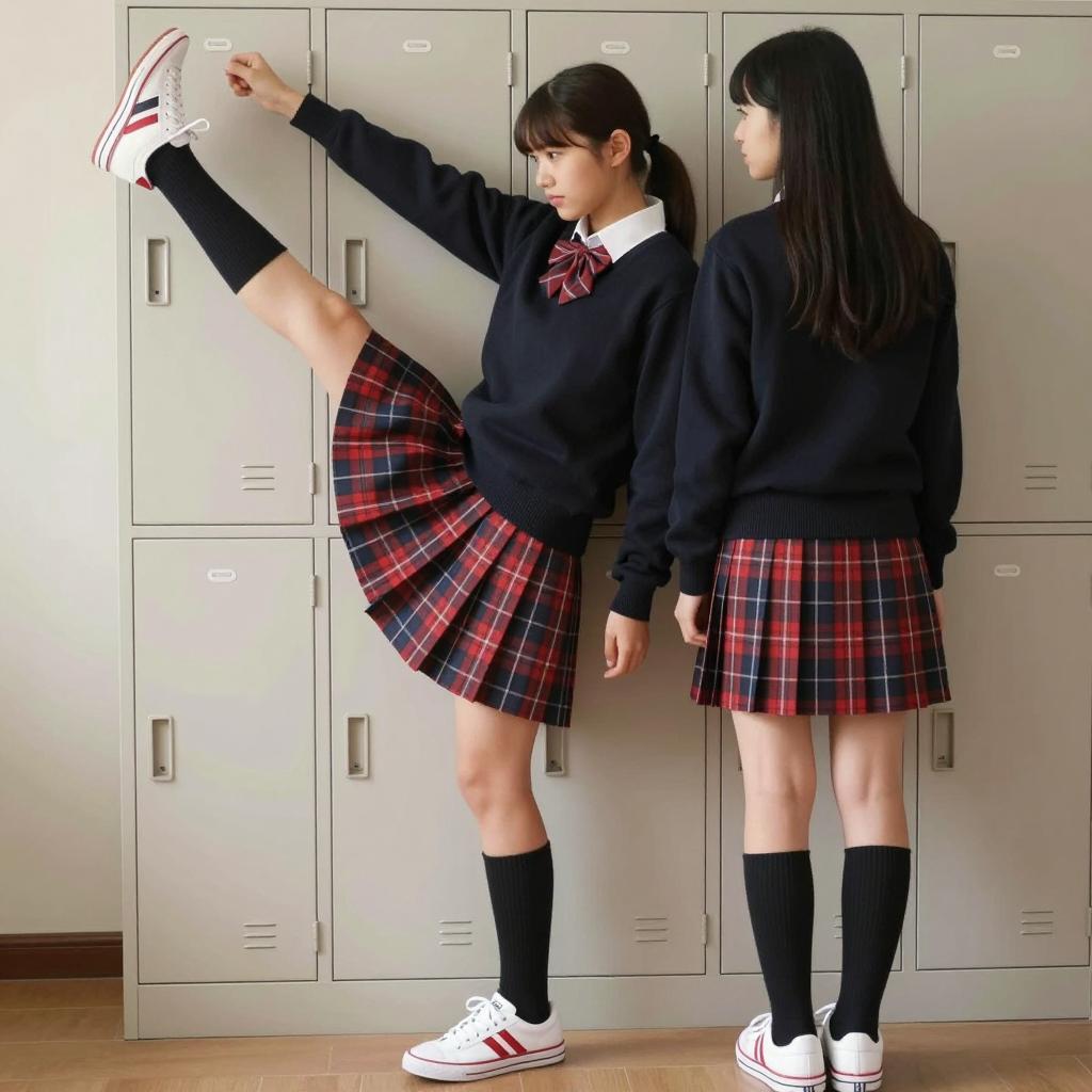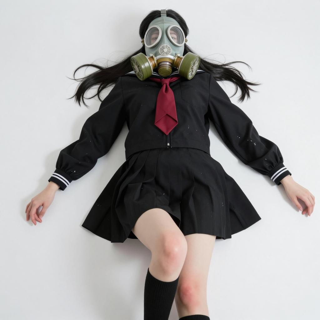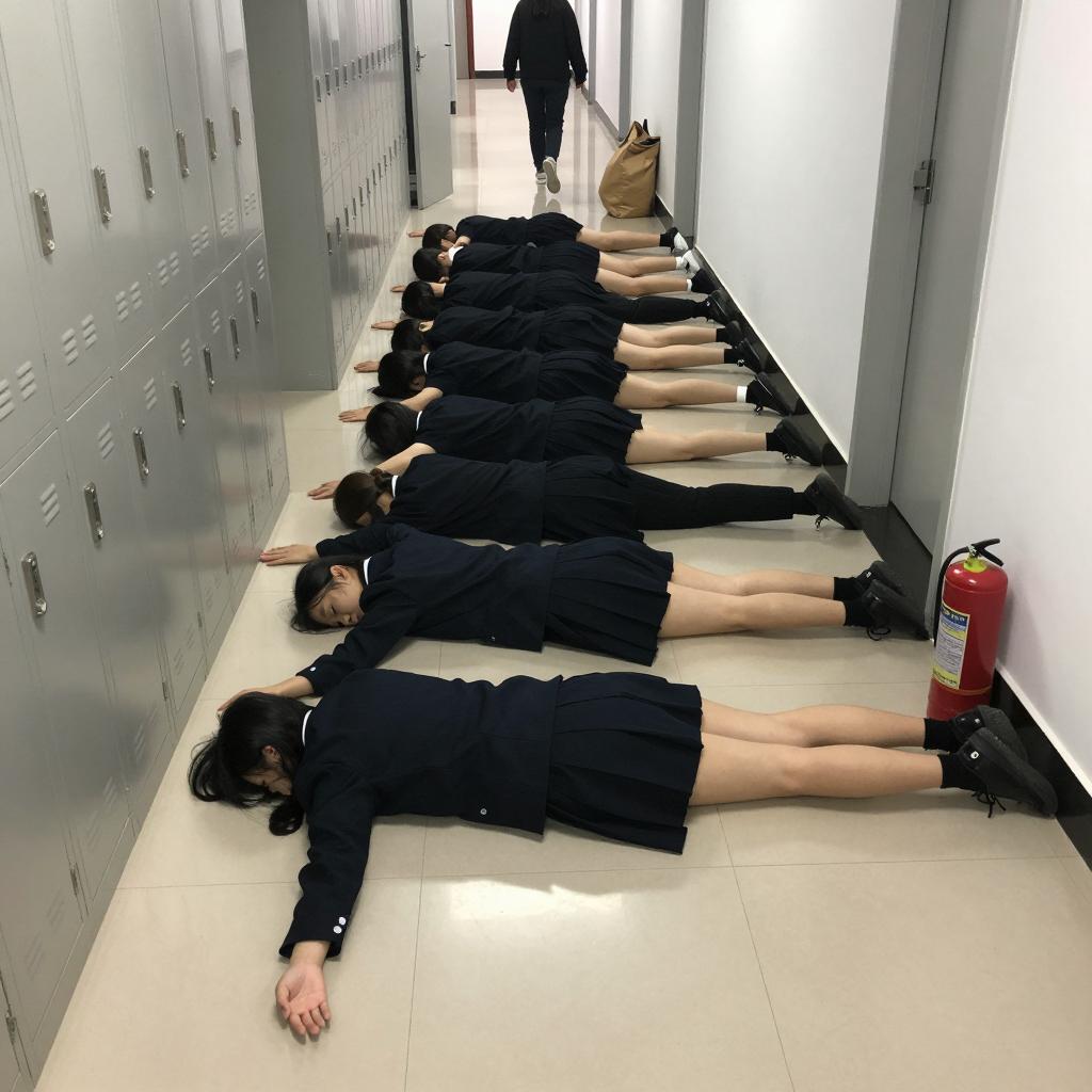 Photograph of ten schoolgirls in black uniforms, lying face down in a long, narrow hallway with metal lockers on the left. They are in a row, arms outstretched, legs straight, and feet pointing forward. One girl's hand is visible in the front. The hallway has white tiled floors, and a person walks away in the background. A brown bag and red fire extinguisher are on the right.