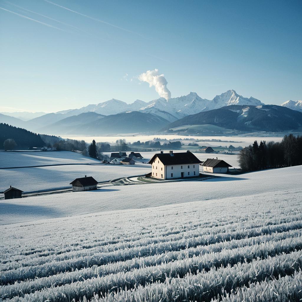 Photorealistic image of snowy meadows and wheat fields with a few scattered houses emitting light smoke from chimneys. The late afternoon light creates a cool blue and white tone over the landscape. In the distance, the majestic snow-covered peaks of the Alps rise against a clear sky, with haze subtly blending the scene. The setting evokes a serene, dreamlike winter atmosphere.