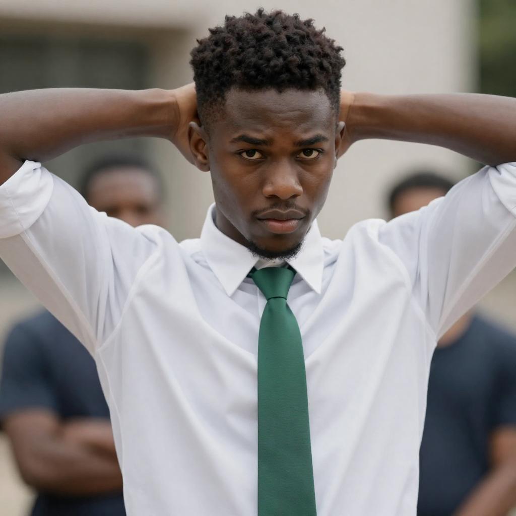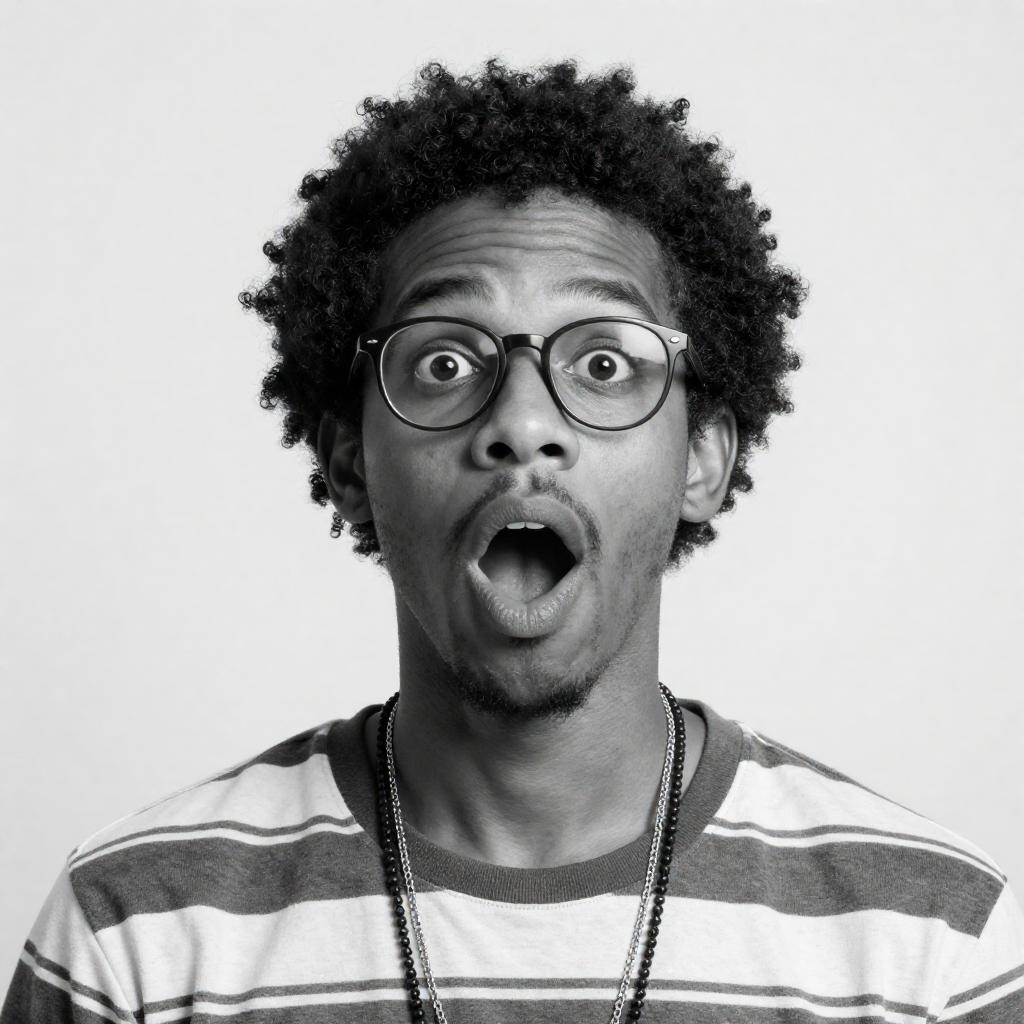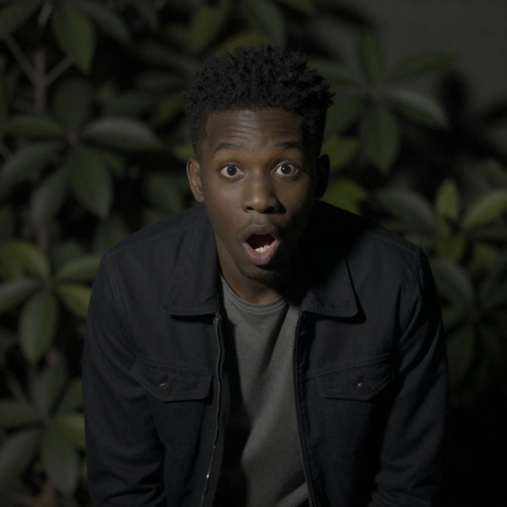 Photograph of a young Black man with short curly hair, leaning forward, mouth open in surprise, wearing a dark jacket over a gray shirt. Dark green foliage surrounds him, dimly lit. Nighttime setting.