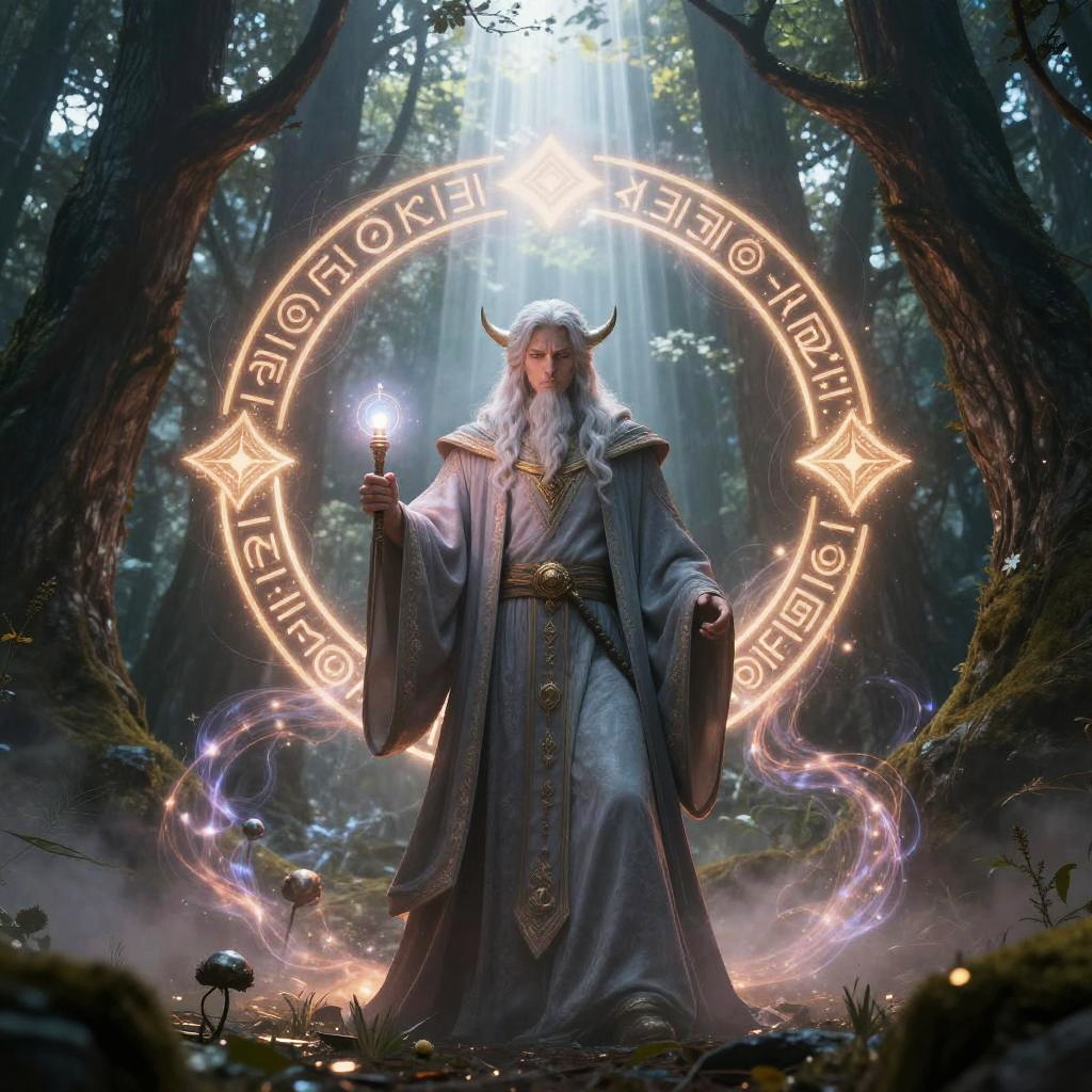 Bald goblin shaman casting a spell in a mystical cave, glowing runes floating in the air, tribal tattoos on his skin, mystical energy swirling, enchanted crystals and magical artifacts surrounding, atmospheric lighting and shadows