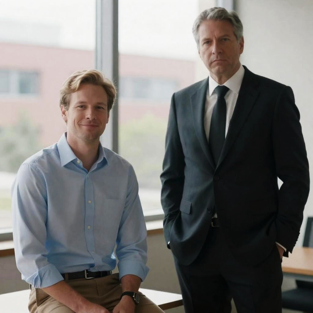 Three men dressed in formal suits standing on a stage in a stadium. The man in the center is bald and wearing sunglasses with a neutral expression. The man on the left has brown hair and is smiling, while the man on the right has blonde hair and a serious expression. A large screen in the background displays a close-up image of an orange American football. An audience is blurred in the foreground.