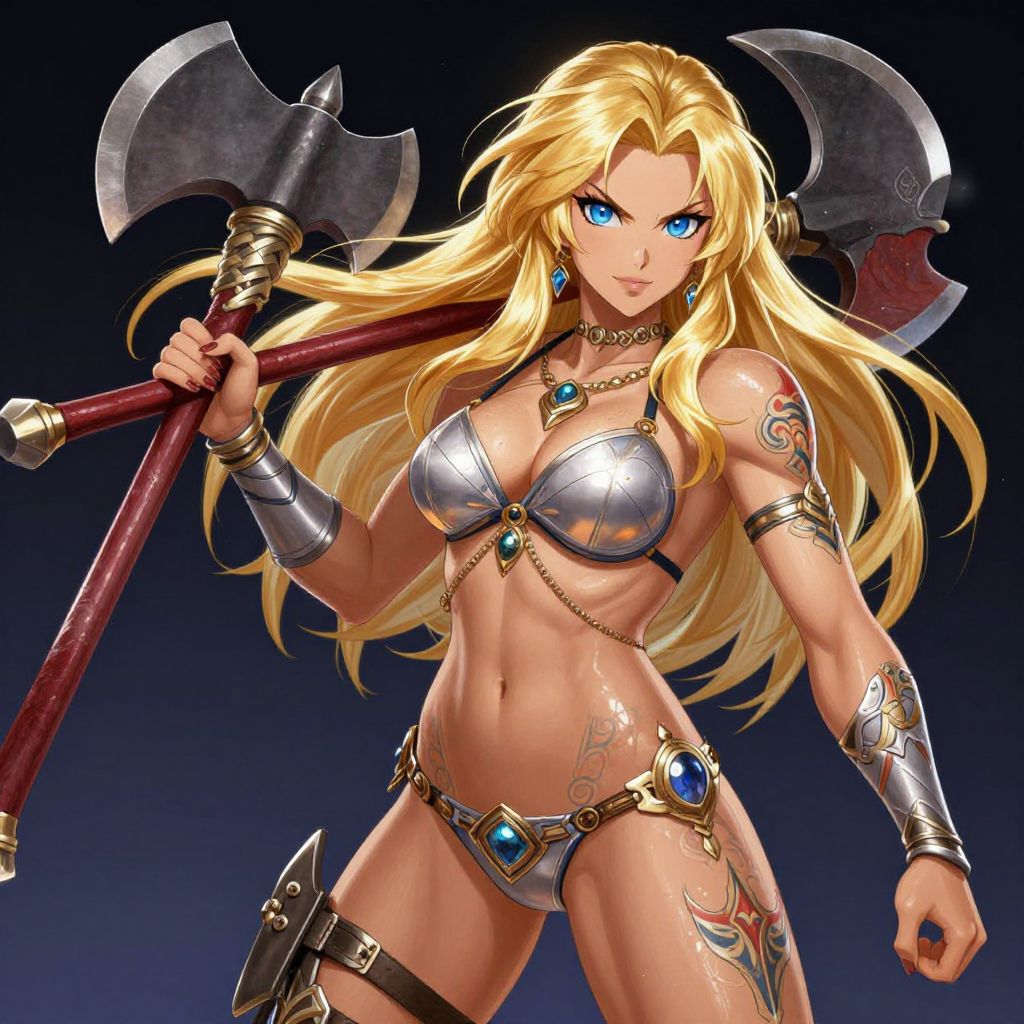Digital anime-style illustration of a fierce blonde warrior woman with long, flowing hair and piercing blue eyes. She wears a silver, metallic bikini with blue gemstones, adorned with intricate gold chains and armlets. Her muscular physique is highlighted by her tattoos and she holds a large double-headed axe over her shoulder. The background is a gradient from dark blue to black. Her expression is determined, and her pose is strong and confident, showcasing her powerful build and battle-ready stance. The image has high contrast and vibrant colors, emphasizing her striking appearance.