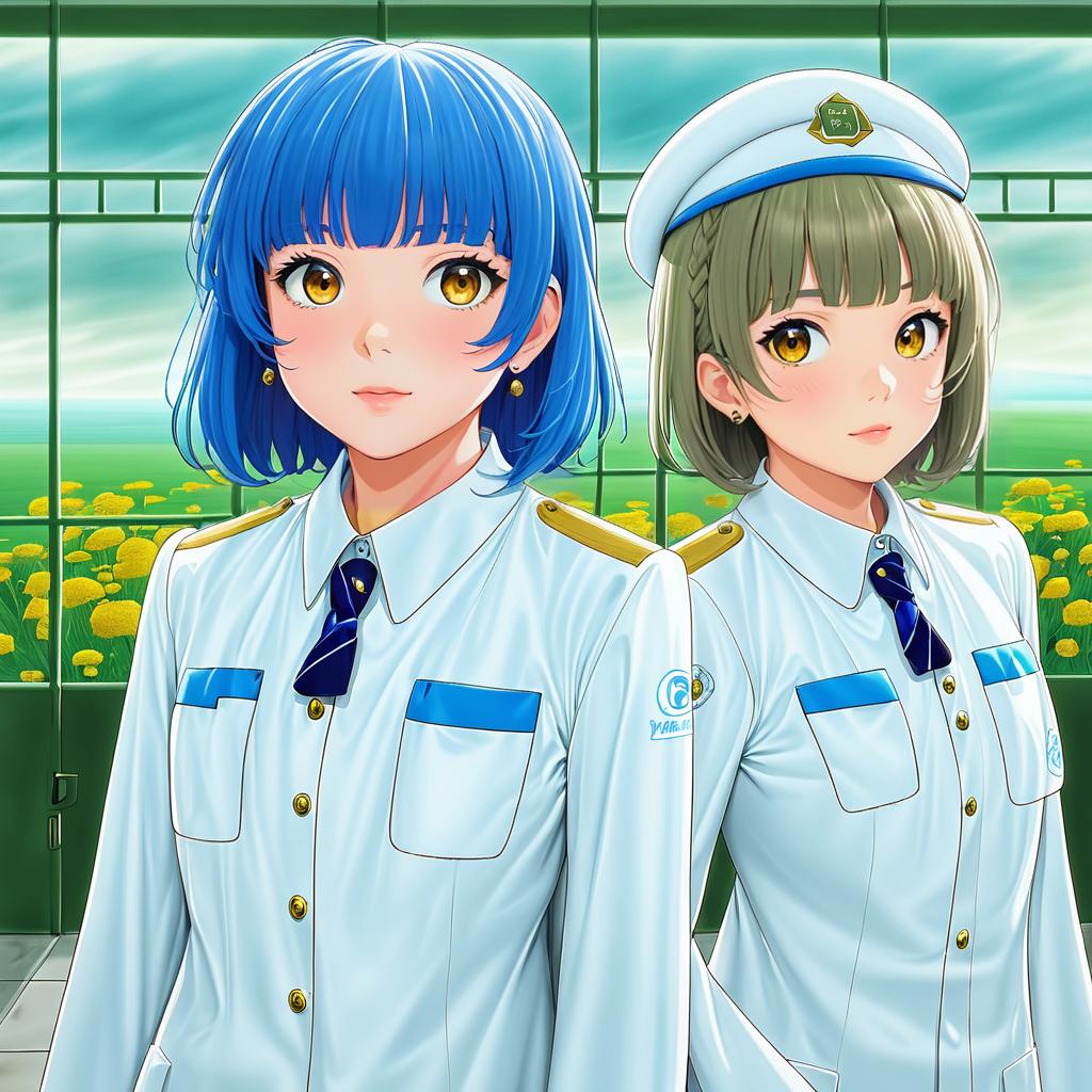 Aika granzchesta, aria (manga), 1girl, yellow eyes, brown eyes, blue hair, short hair, himeya company uniform, uniform, himeya company uniform, uniform, white dress, long dress, hat, earrings, by artist alex ahad, anime