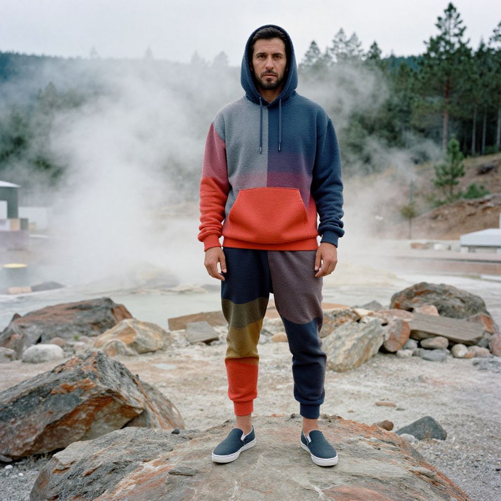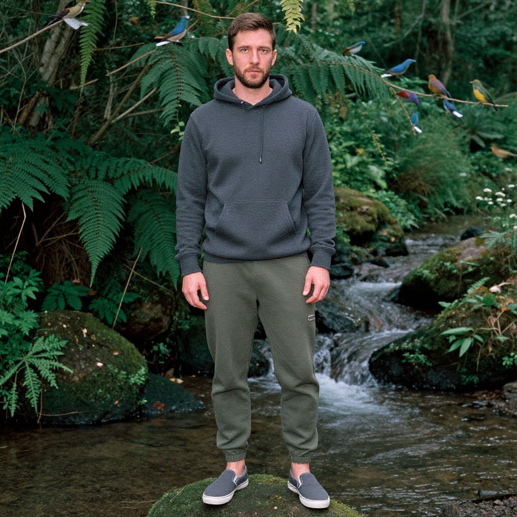 A man, relaxed-fit hoodie, tapered sweatpants with zip pockets, slip-on trainers, heathered charcoal and olive green, soft fleece material, lush green undergrowth, trickling stream, chorus of chirping birds, technicolor analog film stock, serene expression Man has masculine face and piercing eyes