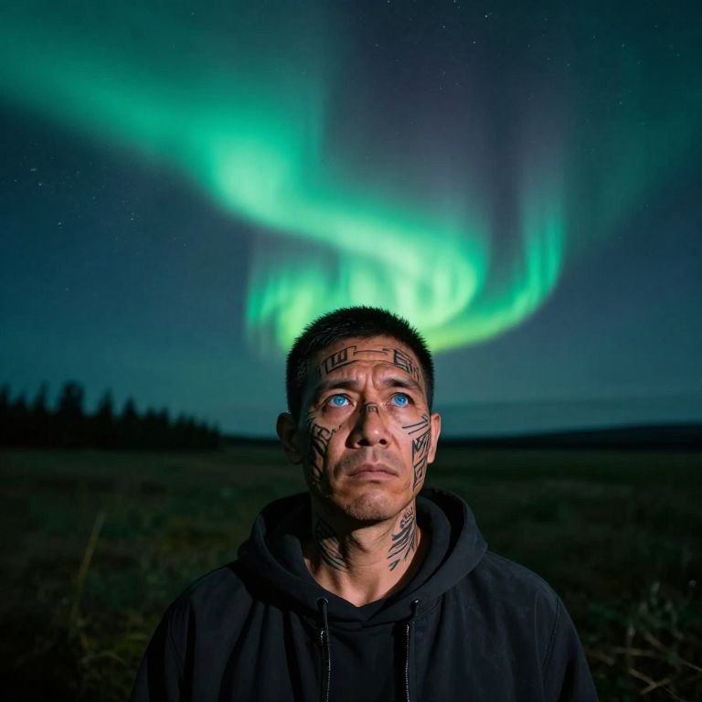 A charismatic figure stands amidst a vast landscape illuminated by an ethereal aurora borealis, their hazy blue eyes and determined expression captured from a unique 'worm's-eye' view perspective. The intricate tribal tattoos adorning their creased face exude resilience and wisdom. The interplay of the natural beauty of the surroundings with the artificial light creates a striking contrast, drawing attention to their features and inviting viewers into a captivating narrative. This photorealistic portrait seamlessly blends hyperrealism with an atmospheric, dreamlike quality, evoking both awe and introspection.