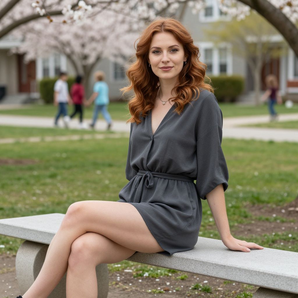 A casual woman with wavy auburn hair and a calm smile is wearing a flowing charcoal gray romper, sitting on a park bench in a green suburb neighborhood, with spring flowers blooming in the background and children playing nearby.