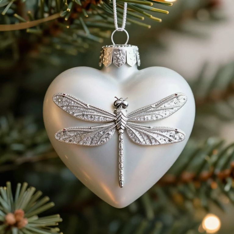 Close-up of a silver heart-shaped Christmas tree ornament decorated with a detailed dragonfly design. The ornament is hanging from a branch of a pine tree, showcasing festive holiday decor.