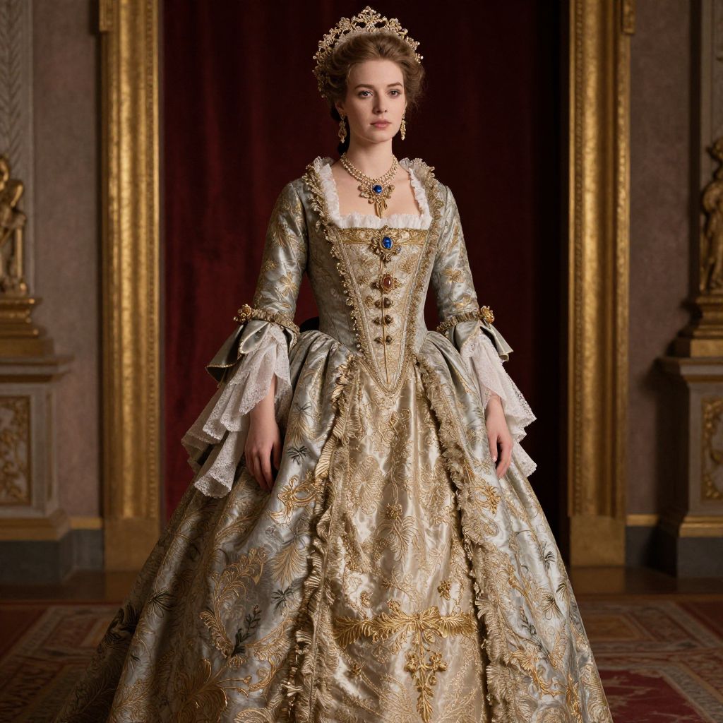 This stunning image features a woman dressed in an opulent, intricately designed gown reminiscent of royal fashion from a bygone era. The elaborate detailing and luxurious fabrics create a captivating visual, set against a richly adorned backdrop that enhances the overall grandeur.