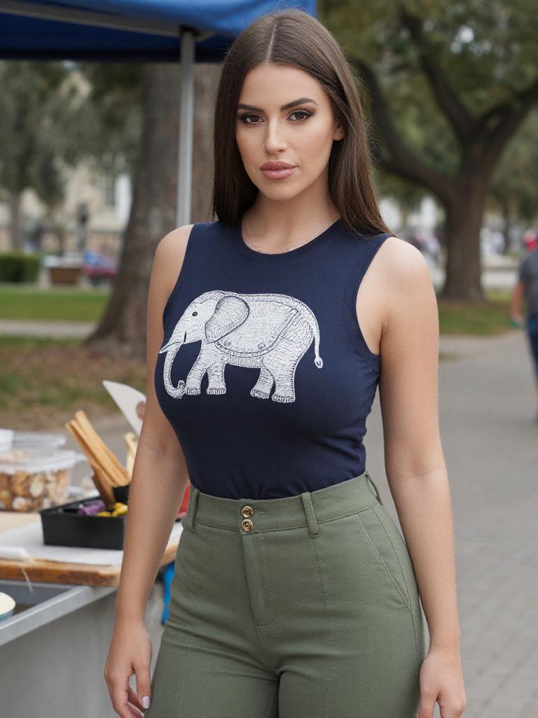 A busty woman in a casual sleeveless navy top with a white elephant print and olive green slim-fit trousers, styled in the visual manner of Juan Francisco Casas Ruiz, stands at a street food vendor in a university campus. Sexy. Pretty face and beаutiful eyes. Big breasts