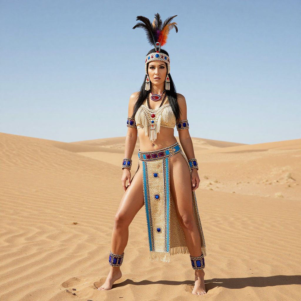 Photograph of a Native American woman standing in a sunlit, sandy desert with clear blue skies. She has long black hair, wears a headpiece with black and red feathers, and is adorned with turquoise and red bead jewelry. Her outfit includes a beige, fringe-patterned crop top and a matching, beaded skirt with a long, hanging fringe. Her legs are bare, and she wears ankle bracelets. Her stance is strong and confident, feet slightly apart. The sand dunes in the background are smooth and undisturbed, highlighting the bright, clear day. The overall style is traditional Native American with vibrant, colorful details.