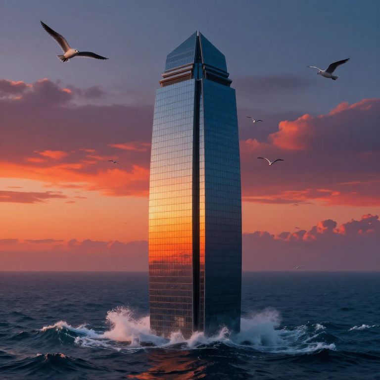 Photograph of a tall, glass skyscraper emerging from the ocean at sunset, surrounded by flying seagulls, with vibrant orange and purple sky.